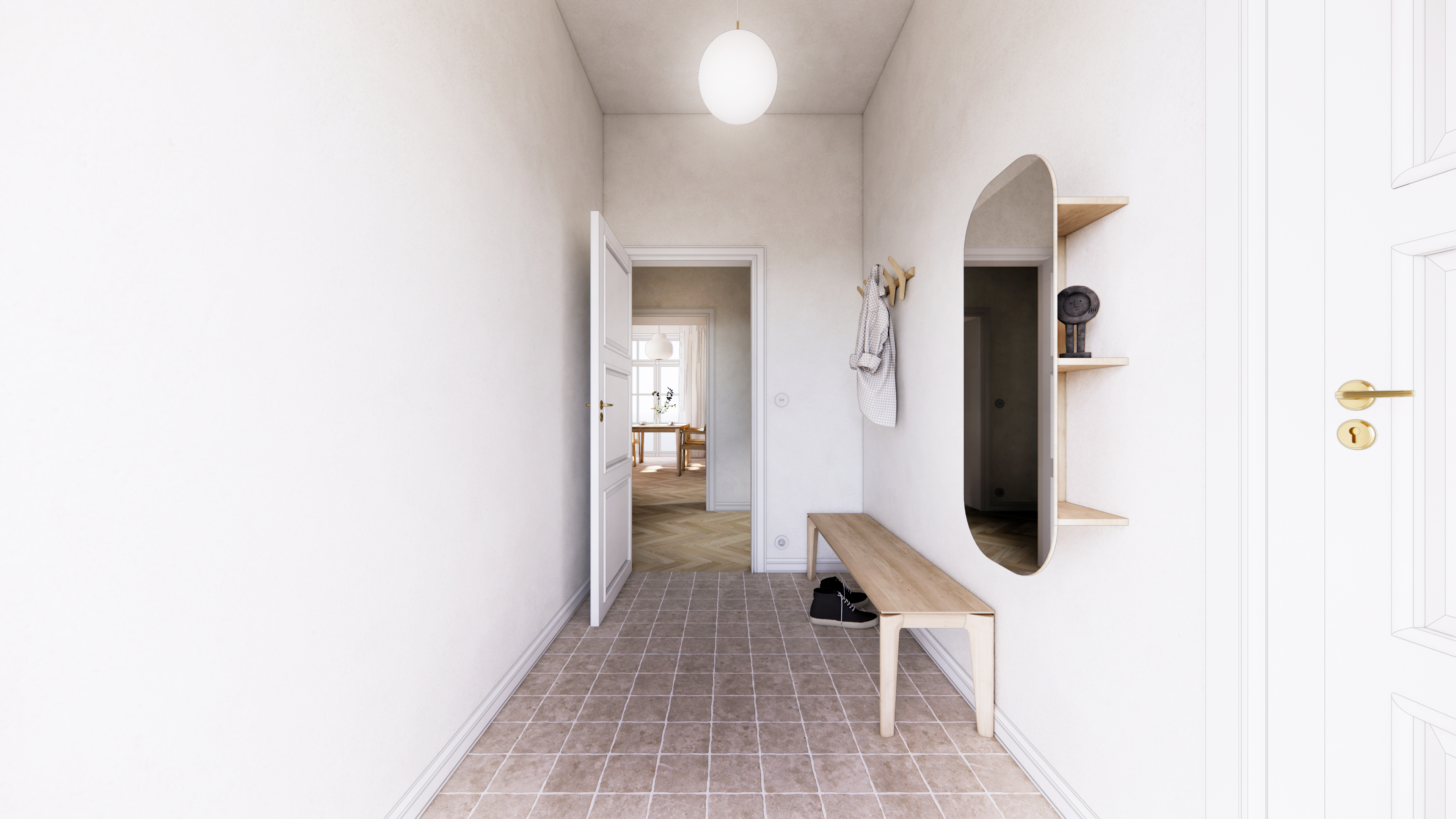 add a small wooden cross above the door leave everything else as it is put a picture on the left wall door is white