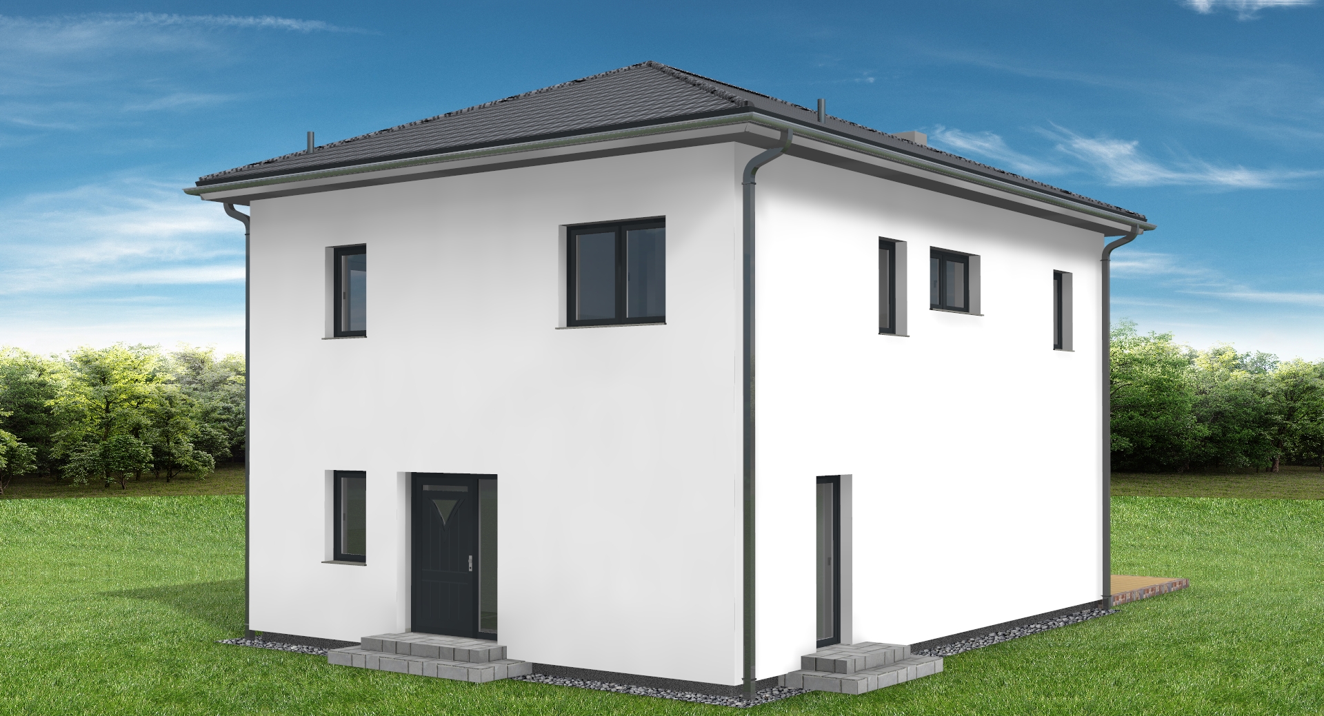 bitte erstelle f r exakt dieses haus eine realistische au enansicht s mtliche parameter und abmessungen des hauses bitte nicht ver ndern dachziegel anthrazit fenster und t ren anthraz fassade wei das haus soll bitte in einem elegant aber dezent gestalteten garten situiert sein mit gepflastertem zugang zur hauseingangst re links im bild