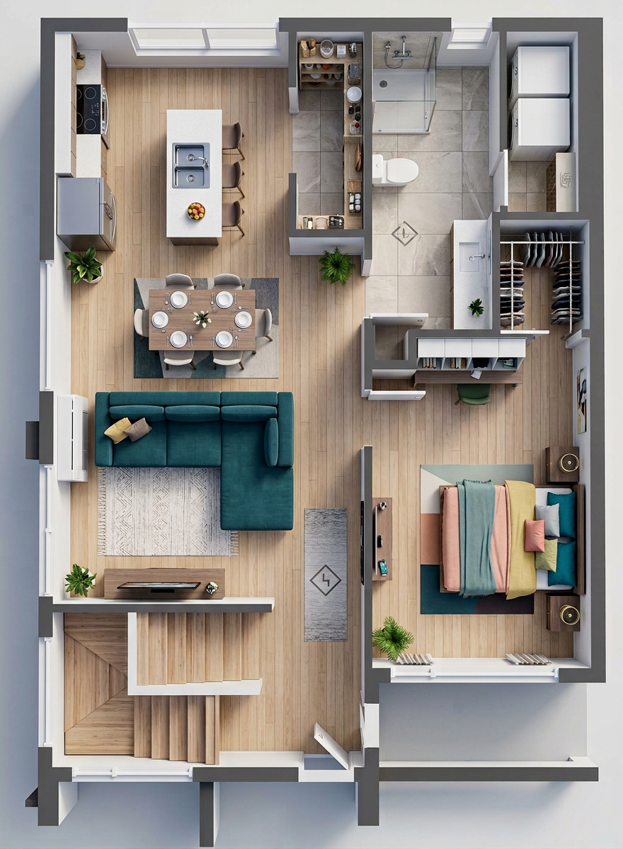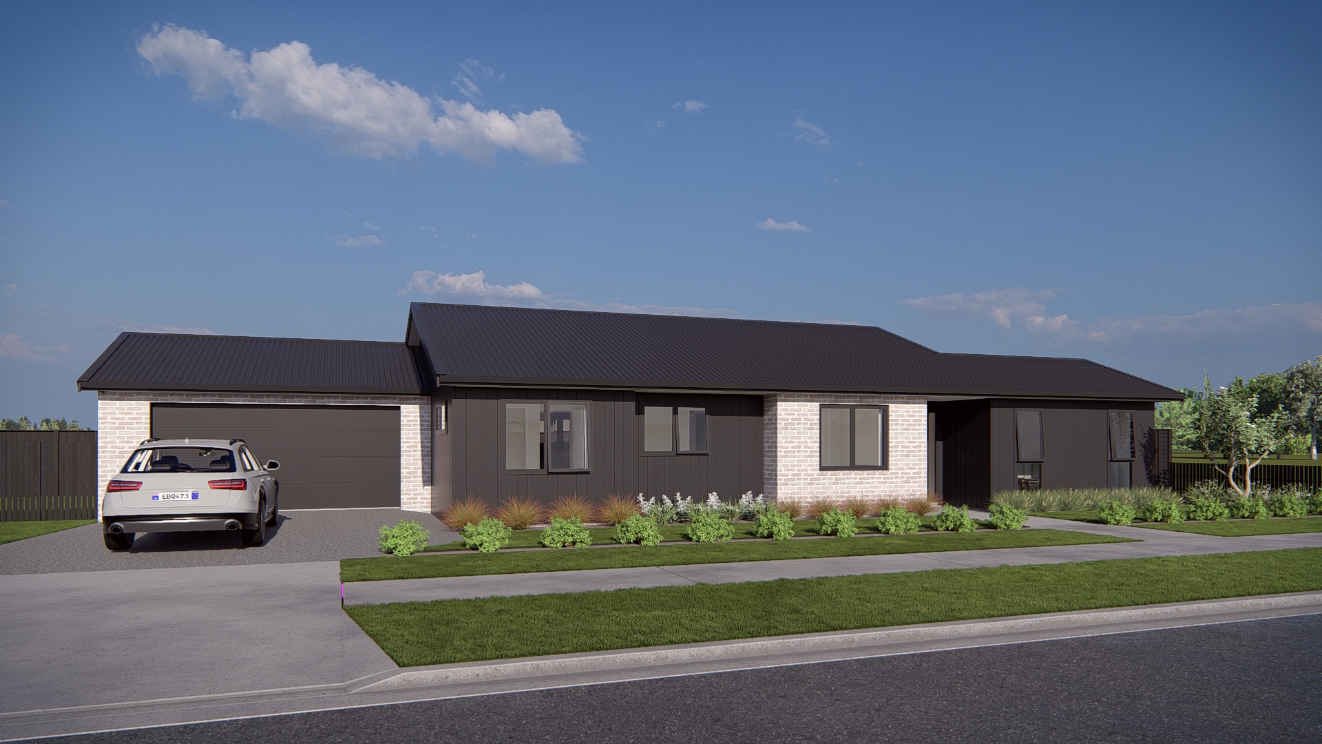 increase the quality of this render and enhance realism to photo quality keep existing architecture keep existing cladding keep existing cladding colours keep existing concrete show established plants manicured lawn colour grade to enhance blues and greens