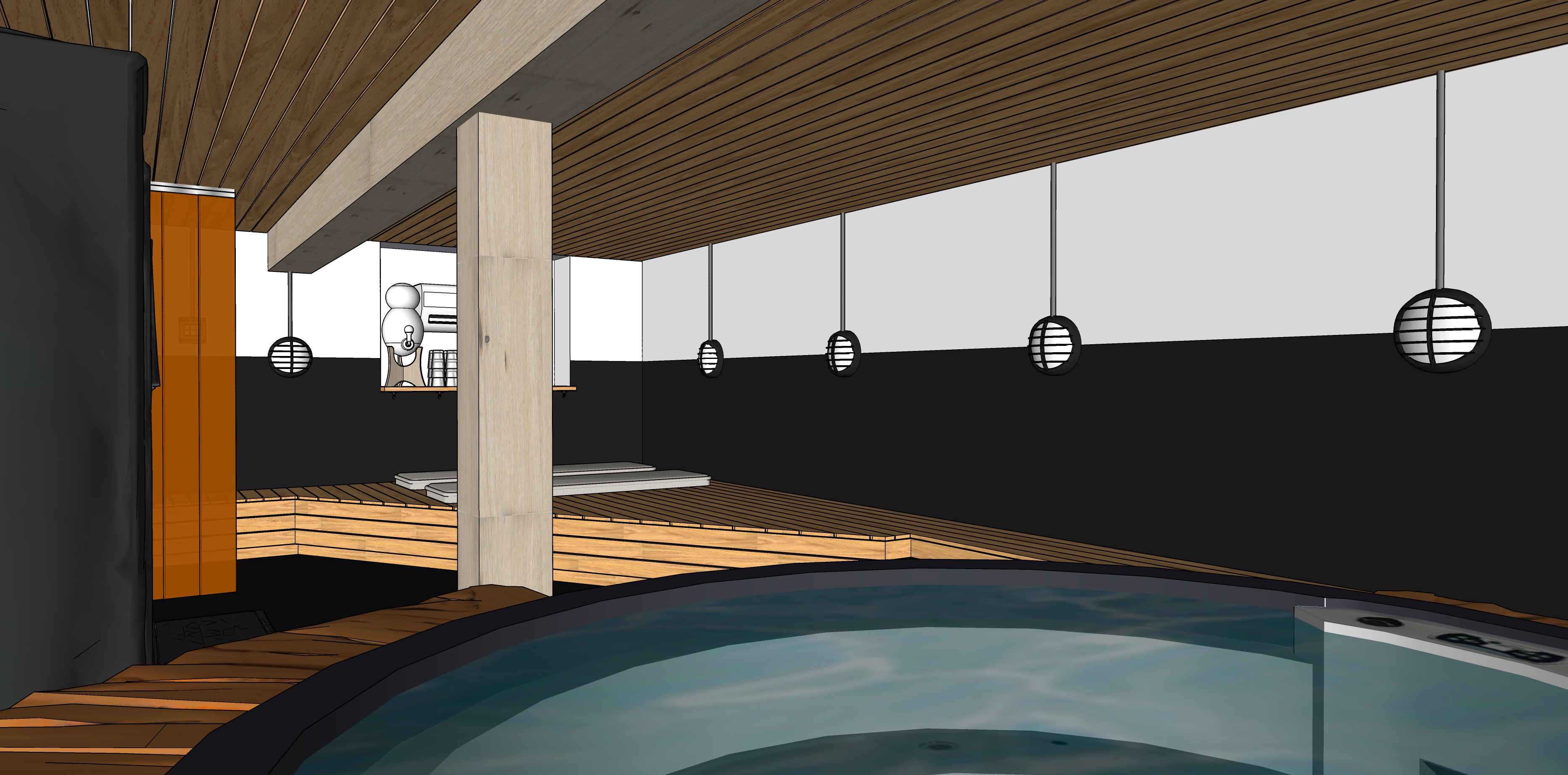 do not change the colors materials finish keep the viewing angle turn on the wall lights create a little smoke coming from the spa on the left only it is a basement without windows but still bright the floor is painted black concrete the bottom of the dry walls are black but the top of the walls is white the curtain is made of frosted amber plastic slats the ceiling and the benches are made of wood dried construction spruce light wood lumber the cushions on the benches are made of linen the structure around the spa is made of wooden slats the exterior of the spa is a dark gray make a light under the wood bench make a broth in the spa
