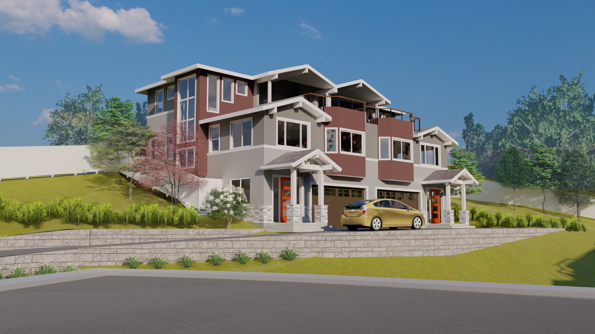 enhance the scene with have photorealistic materials the atmosphere should be serene and inviting with a bright blue sky filled with soft fluffy clouds add cars and people to make feel lively add landscape planting in green areas