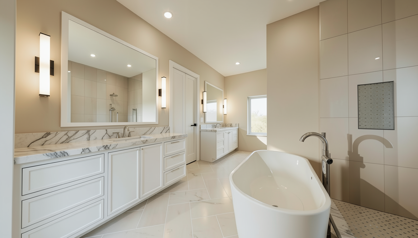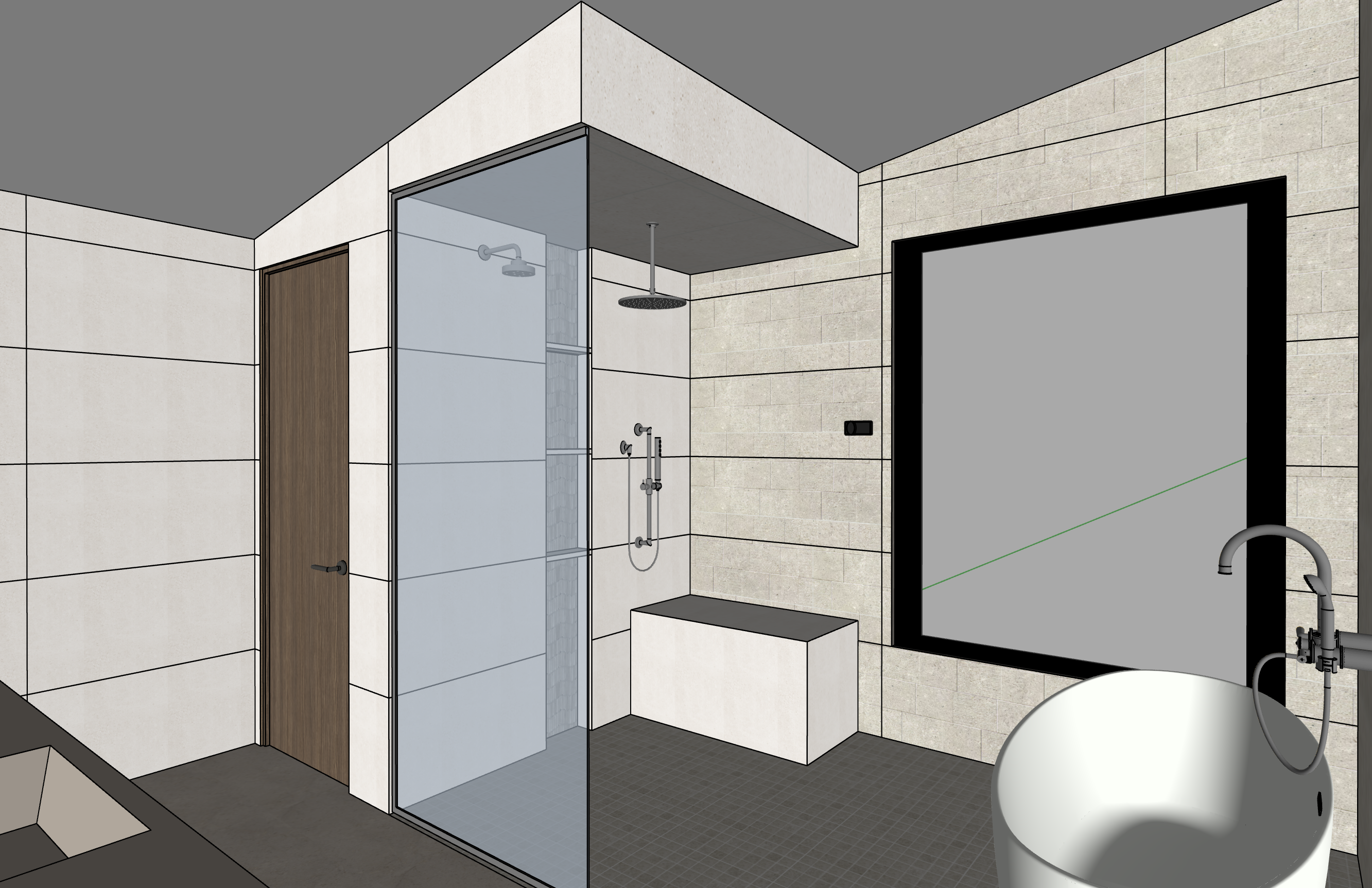 this modern luxury bathroom consists of dorcia bone on the floor bottega white on the walls and block dorcia bone on the shower walls the antique nickel fixtures are paired with a white bathtub and clear shower glass the window looks out to mountains and trees the wall and floor tiles are matte the space is well lit the tile behind the glass should be a light creamy white tile with a limestone inspired look the block dorcia bone on the back wall should look exactly like the original image