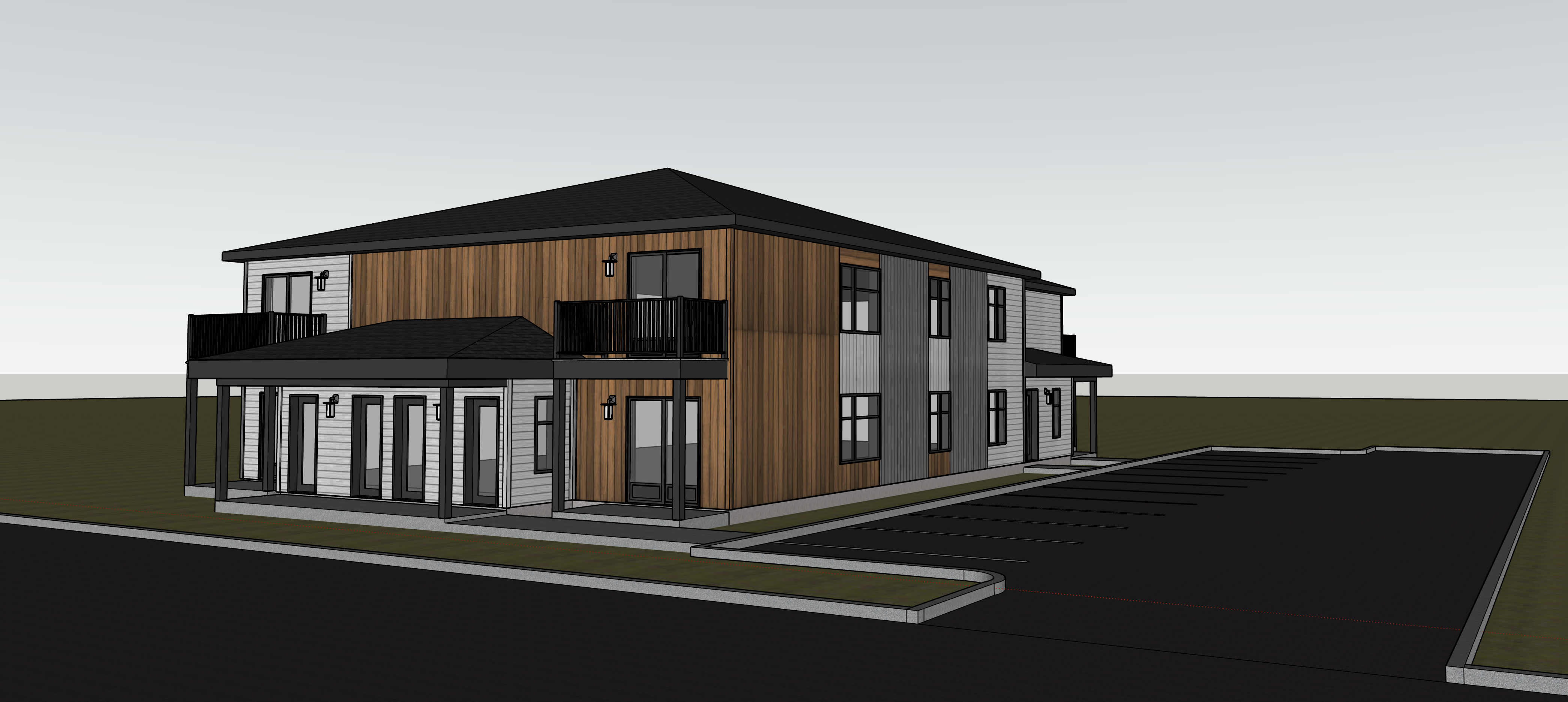 do not modify the building in any way keep 100 of the original architecture exterior materials cladding siding colors textures windows doors roof materials and roof colors exactly as they are in the original image do not reinterpret do not redesign do not restyle do not replace materials only enhance the environment and atmosphere around the building add refined landscaping with realistic vegetation mature trees shrubs grass natural planting beds improve the background with a believable setting add a realistic parked vehicle add subtle human figures for scale improve lighting with warm cinematic late afternoon sunlight add natural shadows and atmospheric depth the building itself must remain completely unchanged