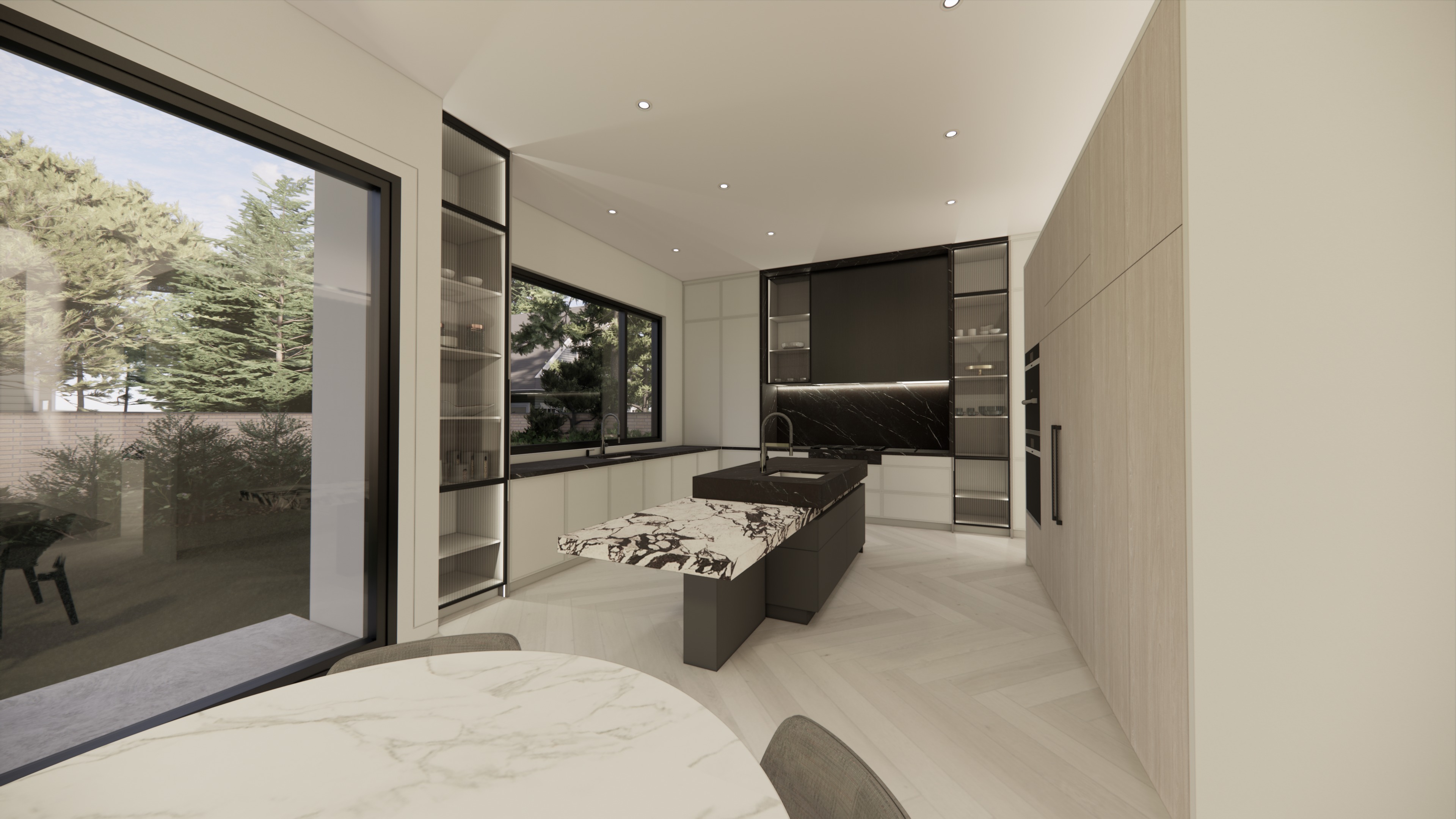 make the rendering more realistic add vertical recessed light inside the displays with tinted and fluted glasses add a glass of white wine and a bottle of wine on top of the dinning table