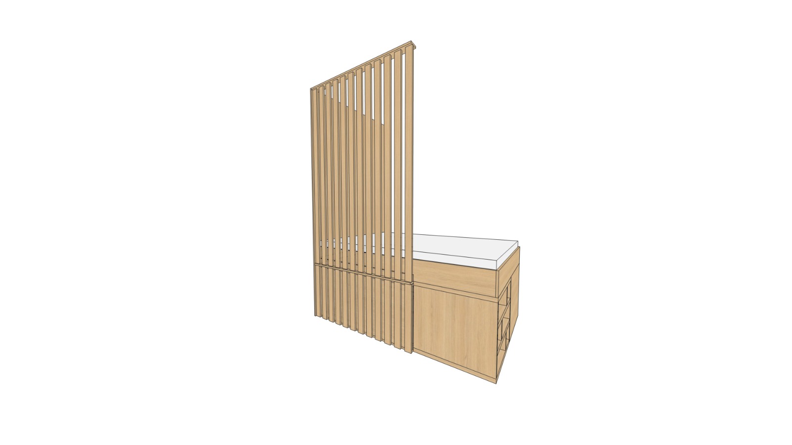 create a high quality photorealistic interior render based on the provided furniture concept the design features a compact built in bed with storage and a vertical slatted partition keep the original proportions and layout exactly as in the image material specification use natural light oak wood egger halifax oak style for all wooden elements vertical slats dimensions approx 18 mm thickness and 70 mm depth seen from front as wider lamellas from side thin profile clean matte finish subtle wood texture interior styling minimalist modern scandinavian interior light neutral walls soft white ivory plaster texture warm wooden floor matching the furniture tone mattress in light fabric beige or light grey lighting soft natural daylight coming from the right side realistic shadows and ambient light no led lighting camera eye level perspective slight wide angle but not distorted focus on furniture detail and material quality mood clean calm modern cozy emphasis on craftsmanship and simplicity remove all sketch lines and convert into a fully realistic render