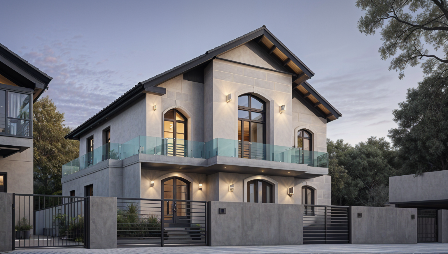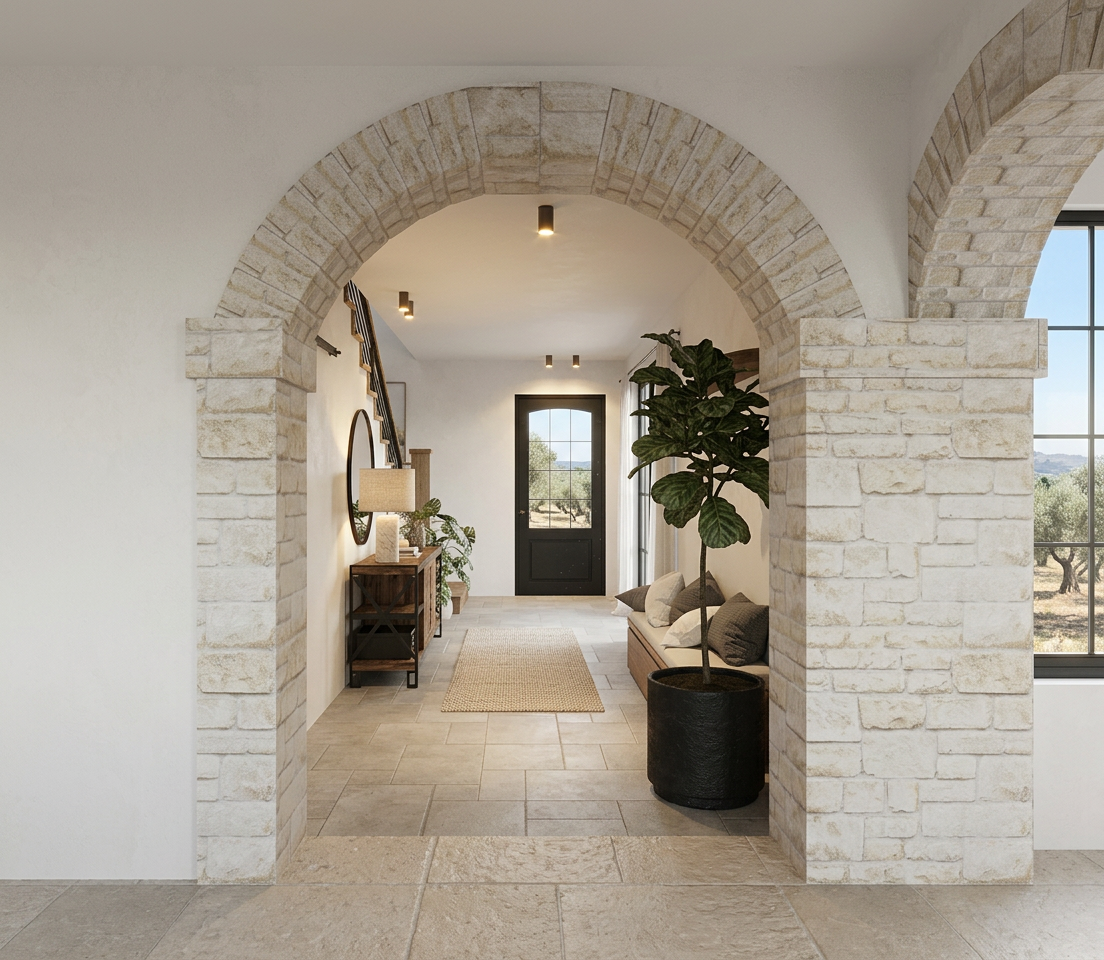 a serene modern architectural interior displaying a large elegant clay pot with a marbled texture in warm earthy tones placed on a small reflective water pool the minimalist staircase curves upwards gracefully with soft golden led lights accentuating each step smooth light beige walls and ceiling contrasted by the dark matte black background create an atmosphere of calm sophistication the wooden beams above are in a natural oak finish complementing the overall neutral palette the ambiance feels tranquil and inviting with a touch of contemporary elegance