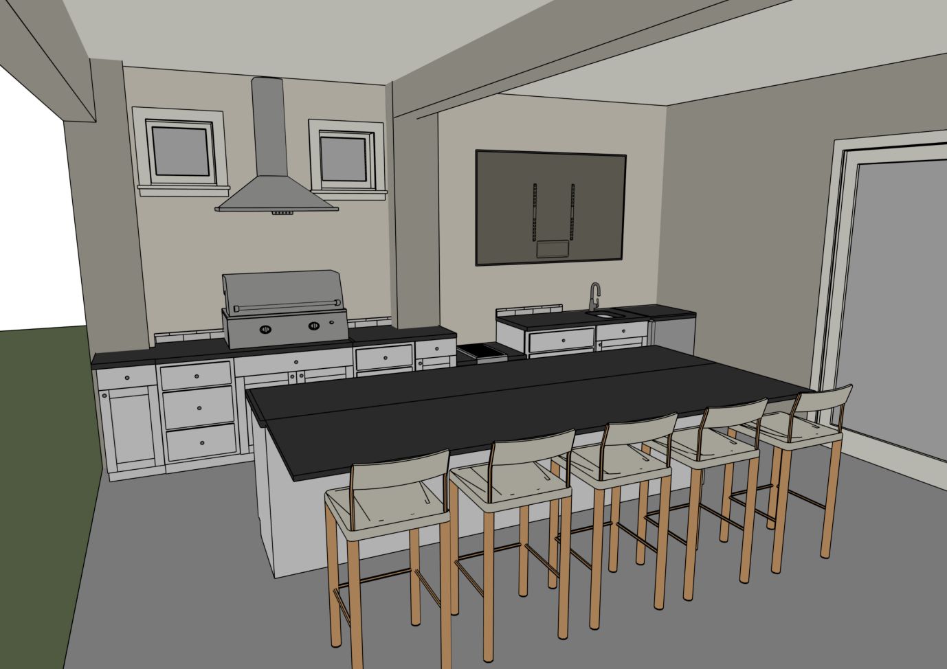 in this summer kitchen i would like to see a mix of light stone materials along with vertical wood treatment materials the countertop should be a lighter quartz color and the cabinets should be a white oak or a version of white oak the back splash to the grill and behind the tv should have a patterned 12 by 12 tile but in keeping with a lighter neutral tones architecture