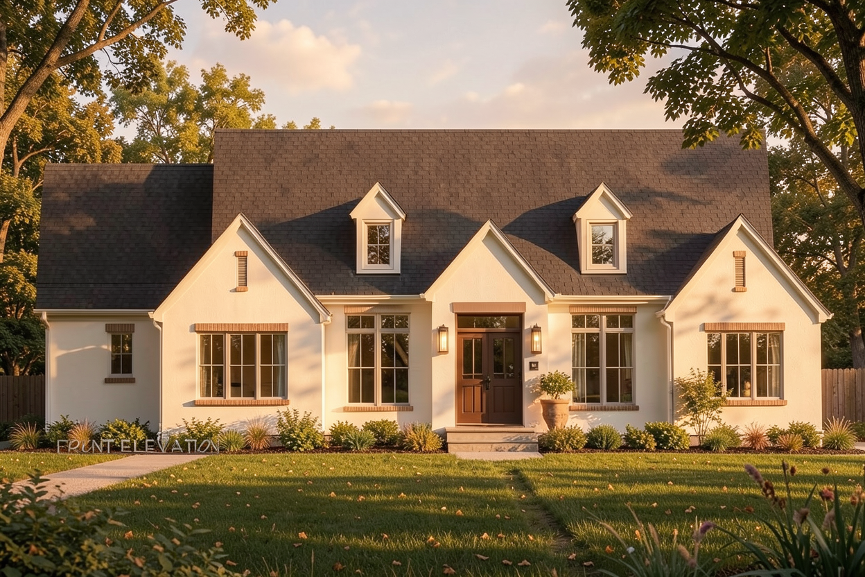black framed windows contemporary style stucco with modern accents add some mature trees in the background add a walkway to the steps add a driveway to the garage door give the building a modern limestone look add some ornaments add more limestone detail to the building make it early afternoon with a nice sky only make the windows rail and light fixtures look black keep the building and the roof caps a light color also show the brick as noted in a modern darkish black grey tone to fit the theme make the window and door framed in black make the awning above the door black as well show the column in brick just like it is shown in my drawing make sure all the materials match the ones represented in the reference image i sent make the roof caps on top a neutral white color show the roof caps in a modern style similar to the way the original drawing is