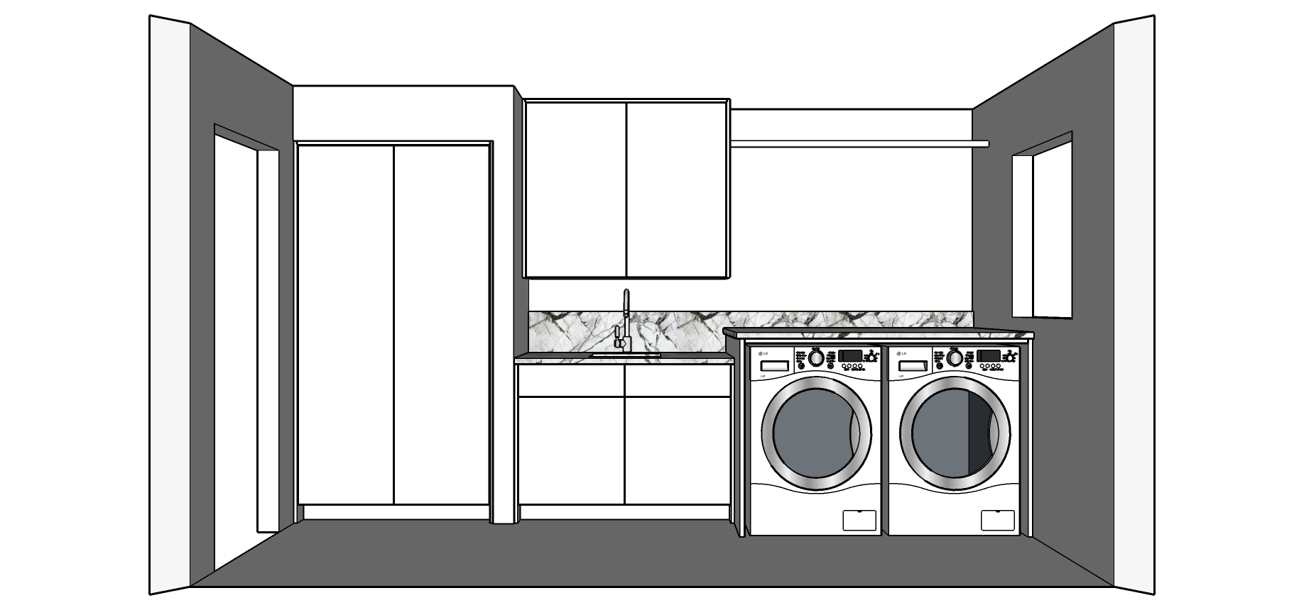 white cabinets flat slab doors and drawer fronts no hardware door on right is interior door lg washer dryer are white no shelf above hanger rod hanger rod is chrome door on right is interior door no door on right walls are white rift sawn white oak hardwood floors no door on the right on this is a wall door is on the left the drawer under the sink should be two drawer fronts lining up with the doors below