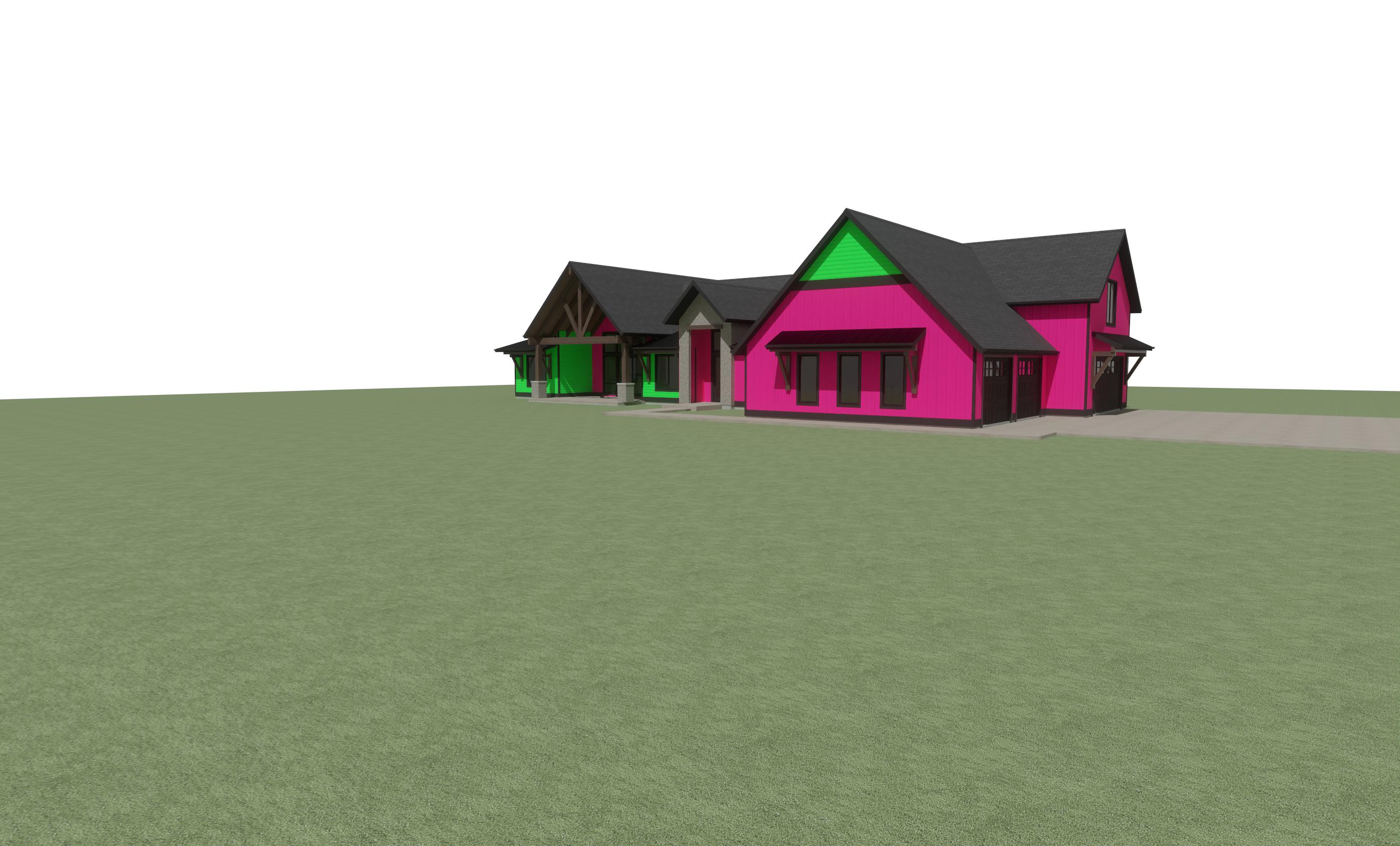 enhance the realism of the existing architectural design while maintaining the same materials and textures focus on realistic lighting shadows and surface details to create a lifelike appearance ensure the mixture of wood siding is preserved in the correct areas making them look authentic and cohesive so keep the horizontal siding and vertical siding the same as reference photo but change texture and color this is in montana add montana landscape but nice landscaping near the house add montana vegetation around house strict mode preserve all geometry exactly no design changes siding material critical pink board and batten make texture with tight linear wood grain striations not smooth not flat pronounced horizontal grain pattern make the color cool gray brown with subtle variation slightly weathered tone here is the rbg for the lighter color rgb 211 202 192 here is the rbg for the darker color rgb 79 71 62 grain should appear compressed and consistent not wide or rustic do not replace with cedar reclaimed wood or generic wood textures do not change color tone warmer or darker siding material critical green lap siding make texture with tight linear wood grain striations not smooth not flat pronounced horizontal grain pattern make color rich dark brown with warm undertones no gray cast slightly weathered tone here is the rbg for the lighter color rgb 135 115 87 here is the rbg for the darker color rgb 47 35 25 grain should appear compressed and consistent not wide or rustic do not replace with cedar reclaimed wood or generic wood textures do not change color tone warmer or darker make all trim around doors and windows trim at bottom of house and fascia diamond kote onyx color make rock like a stacked mountain modern style rock material lock all siding areas must remain siding do not change material locations or boundaries render photorealistic material detail with accurate grain scale and depth material lock all siding areas must remain siding do not change material locations or boundaries render photorealistic material detail with accurate grain scale and depth enhance the realism of the existing architectural design while maintaining the same materials and textures focus on realistic lighting shadows and surface details to create a lifelike appearance ensure the mixture of wood siding is preserved in the correct areas making them look authentic and cohesive so keep the horizontal siding and vertical siding the same as reference photo but change texture and color this is in montana add montana landscape but nice landscaping near the house add montana vegetation around house strict mode preserve all geometry exactly no design changes do not add rock only do the rock thats shown