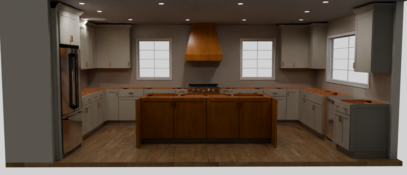 create an ultra realistic veiw of this kitchen add 2 lights over the island 4 green and brass chairs for the isalnd camria ironsbridge countertops and a nice backsplash add an undermount sink under the window to the right
