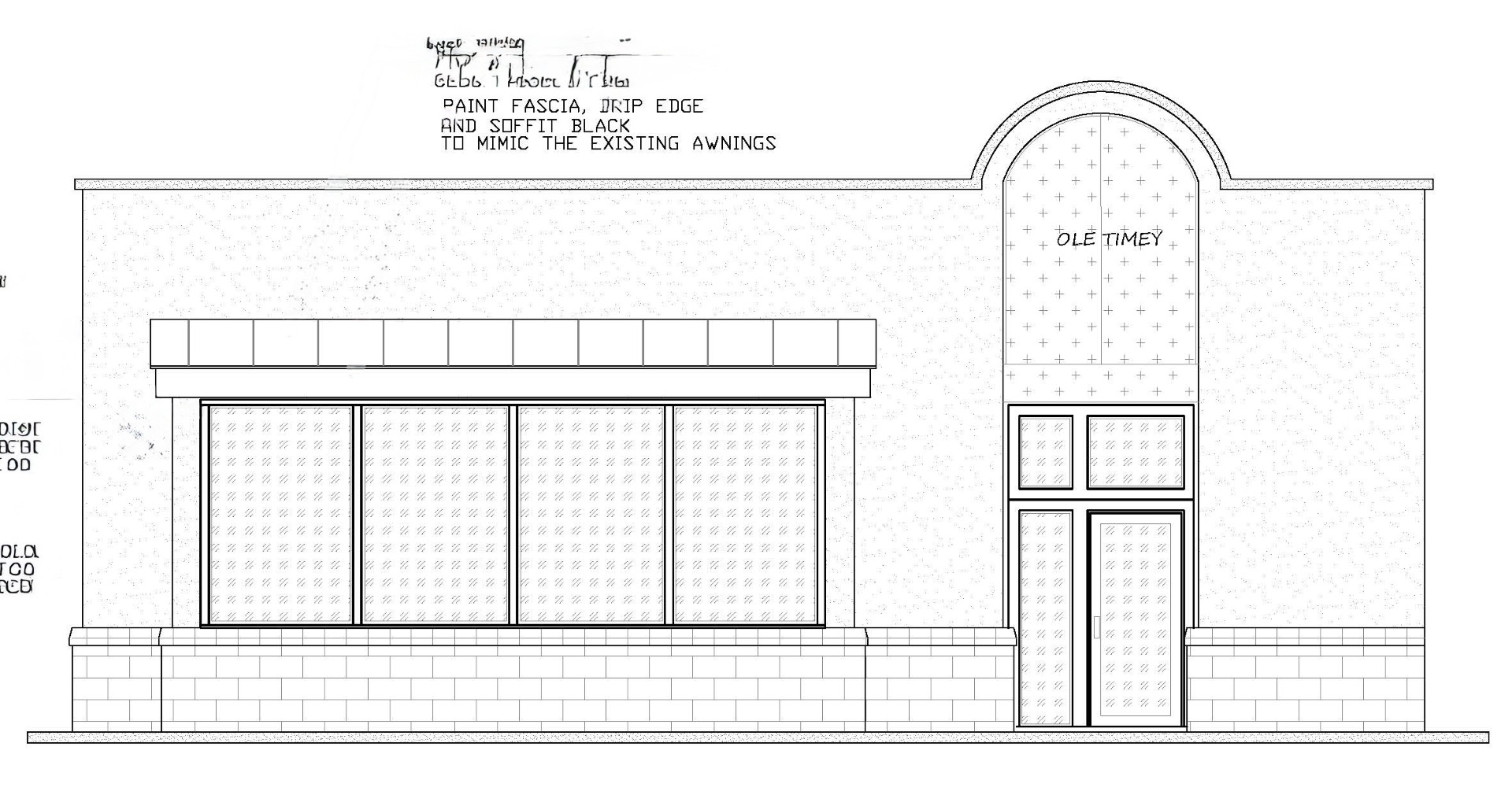 this is a white stucco building with red metal roof cap trim the tall area above the door is a tall black semicircle awning the front elevation left side is a 4 bumpout with a black awning along the top of those windows remove the text on the top