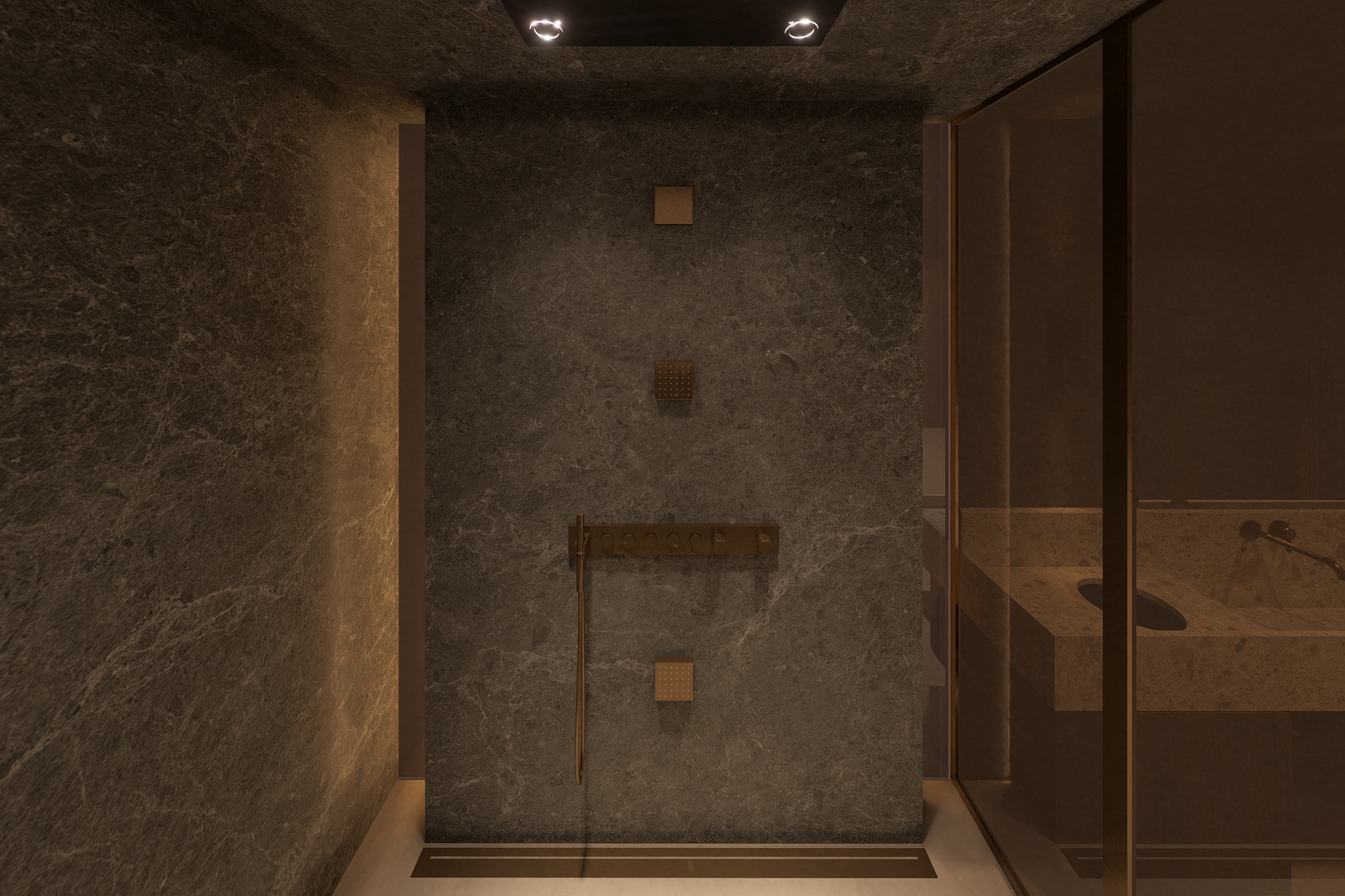 create a photorealistic image add lighting replace materials with photorealistic real materials add reflections and shines to materials insert an ies light cast insert water from top shower