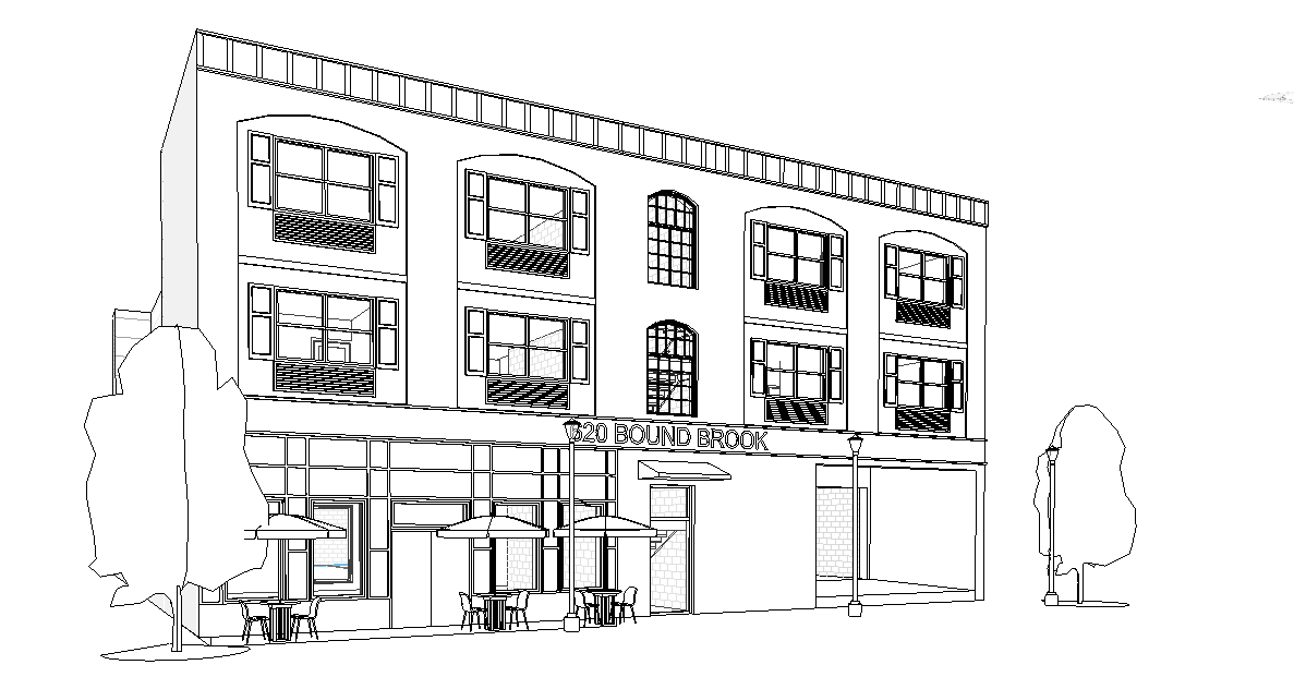 exterior shot show a photorealistic image for this 3 story building in dunellen new jersey at 620 bound brook rd the main facade should be red brick with arched windows and some brick elements around it show street elements with cars in the street and people on the sidewalk