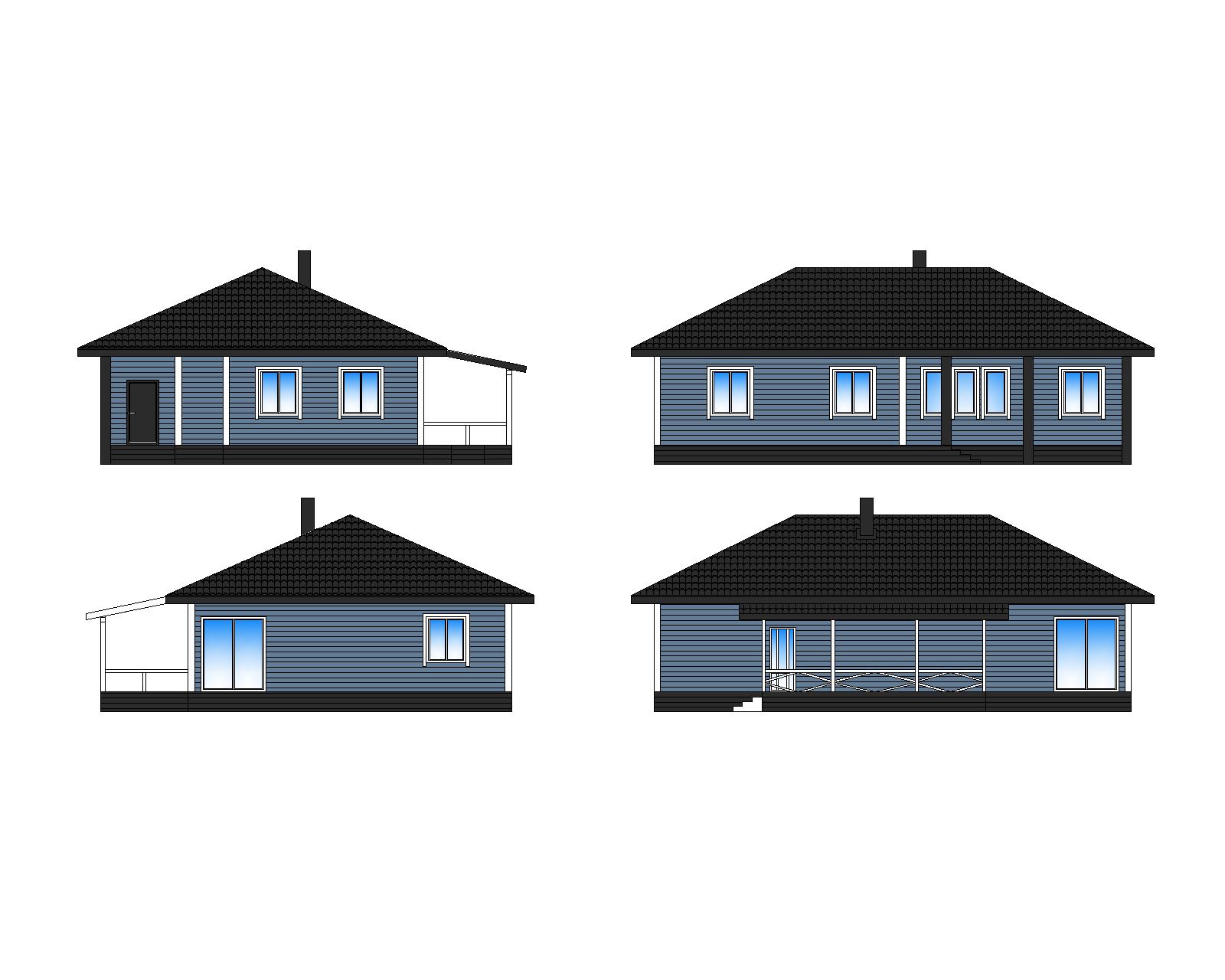 photorealistic rendering of a modern one story house with a gable roof the exterior walls are painted in a sophisticated slate blue color with a contrasting white border around the windows the roof is covered with smooth charcoal gray tiles the sunlight floods the area creating a lively atmosphere against the backdrop of a clear blue sky this image captures the essence of modern country design replace the gable roof with a hip roof