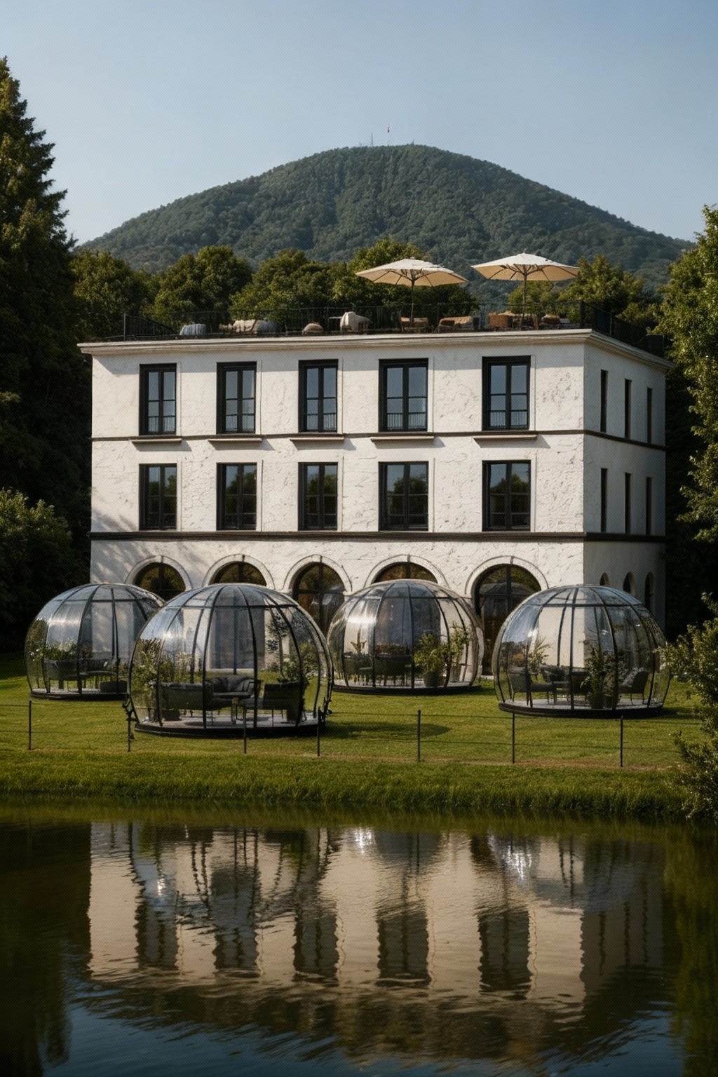 functionalism exterior shot white facade grey window frames add cultural interiors to windows light up letters on facade light trees from ground architecture
