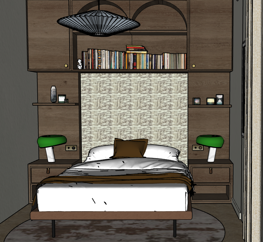 elegant bedroom natural light from the right side of the frame there is no bupholstered headboard the light from the selling is paper white