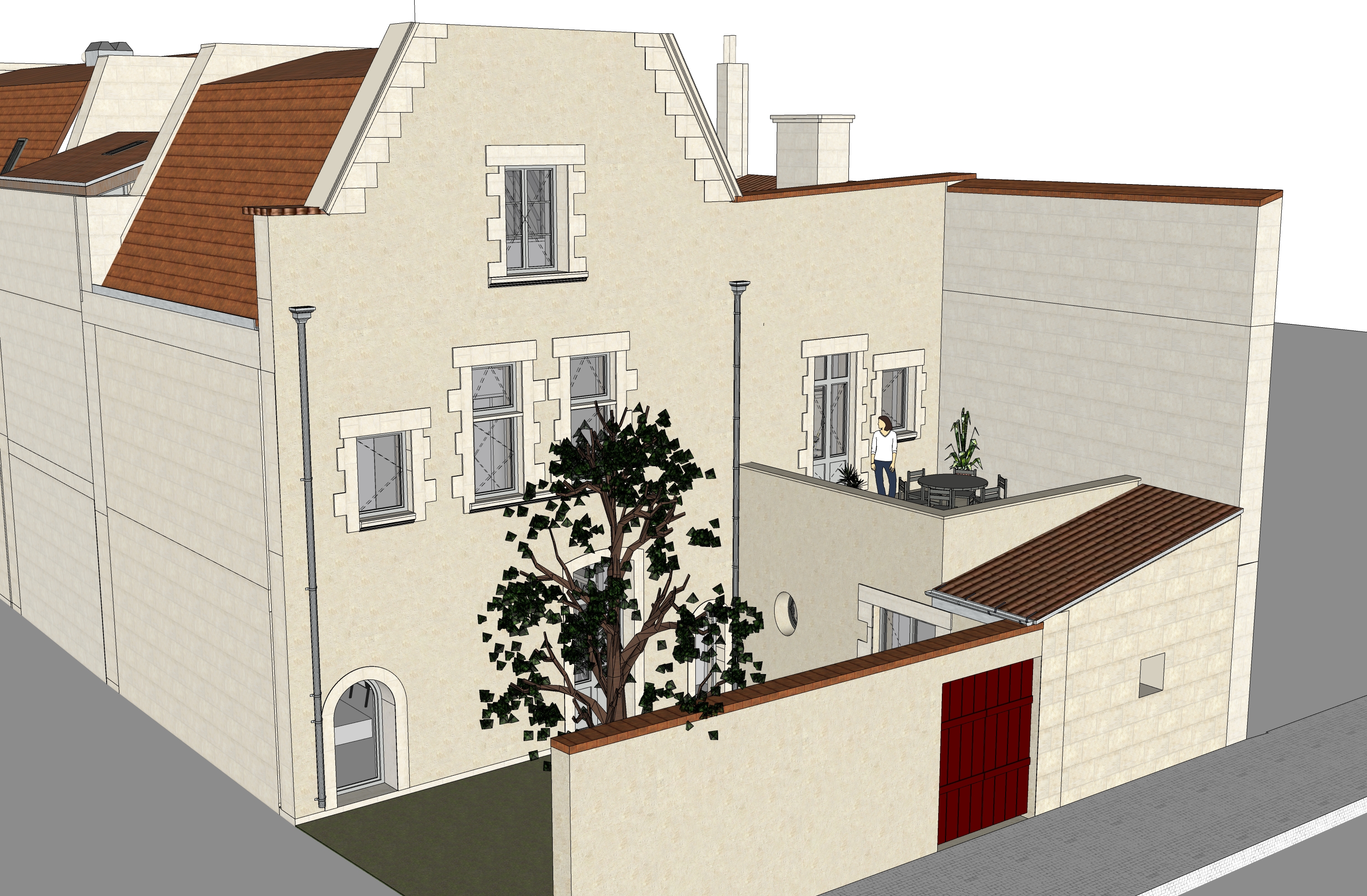 do not add background keep it all white as the model the roof on the on the bottom right is canal tiles the wall without stone texture is stone tone coating the wall with stone texture stay in stone as model not too old make it look like after a building renovation keep the color of joinery and windows as model