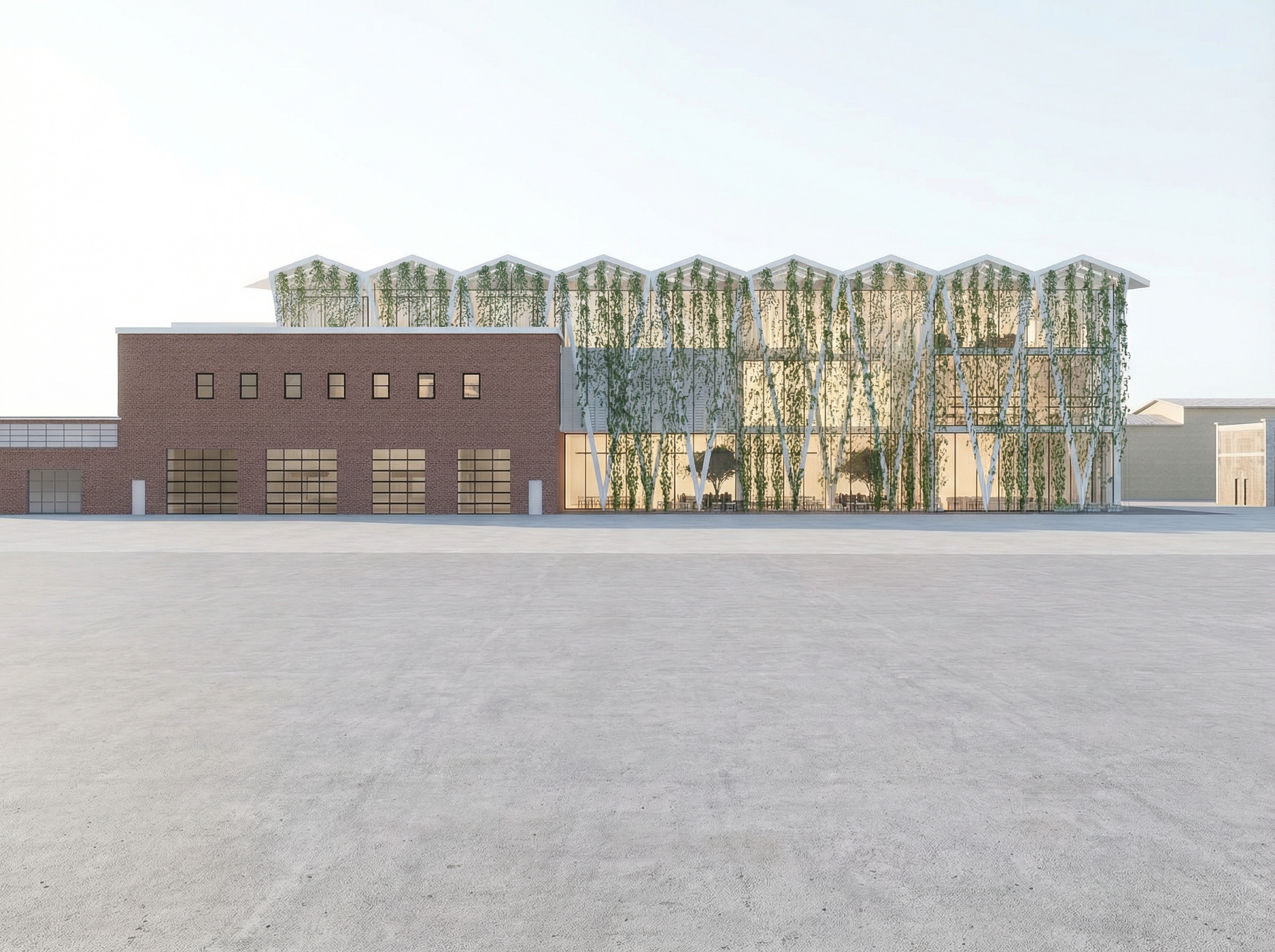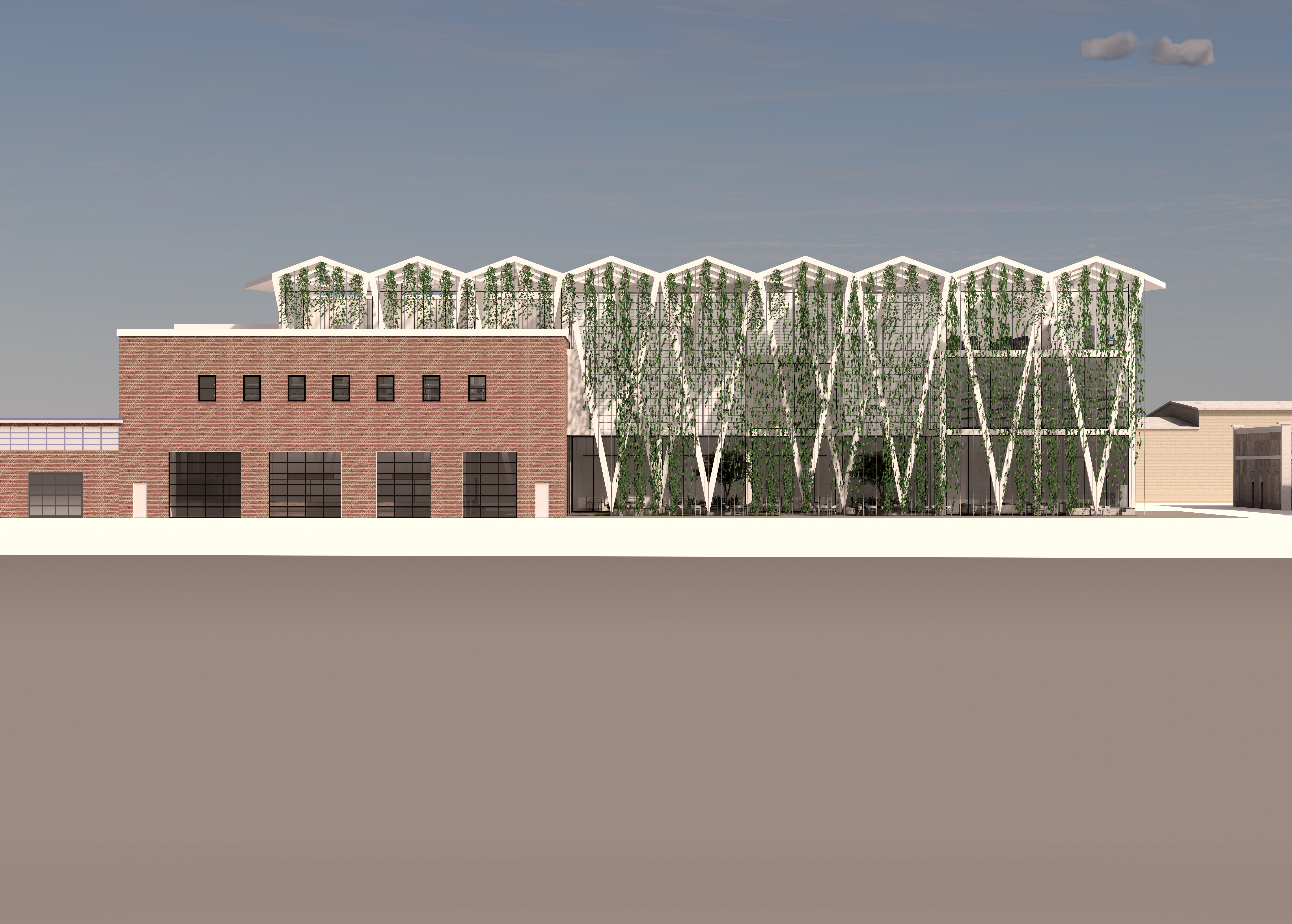 keep the building geometry camera glazing brick and fa ade structure unchanged remove the existing vine texture completely it is incorrect rebuild the green wall system as cable trained vegetation thin vertical stainless steel cables with evenly spaced intervals vines growing along these cables in clear readable strands natural leaf clusters but always anchored to the cable lines visible vertical rhythm similar to the reference fa ade image the new vines should be more architectural and systematic straight growth paths following cables not random smears interior visibility maintain soft interior lighting visible through the glass but not too warm neutral daylight glow clarity increase edge definition so the cable grid and vines appear crisp and intentional do not change fa ade proportions mullions roof rhythm brick tone building form or perspective