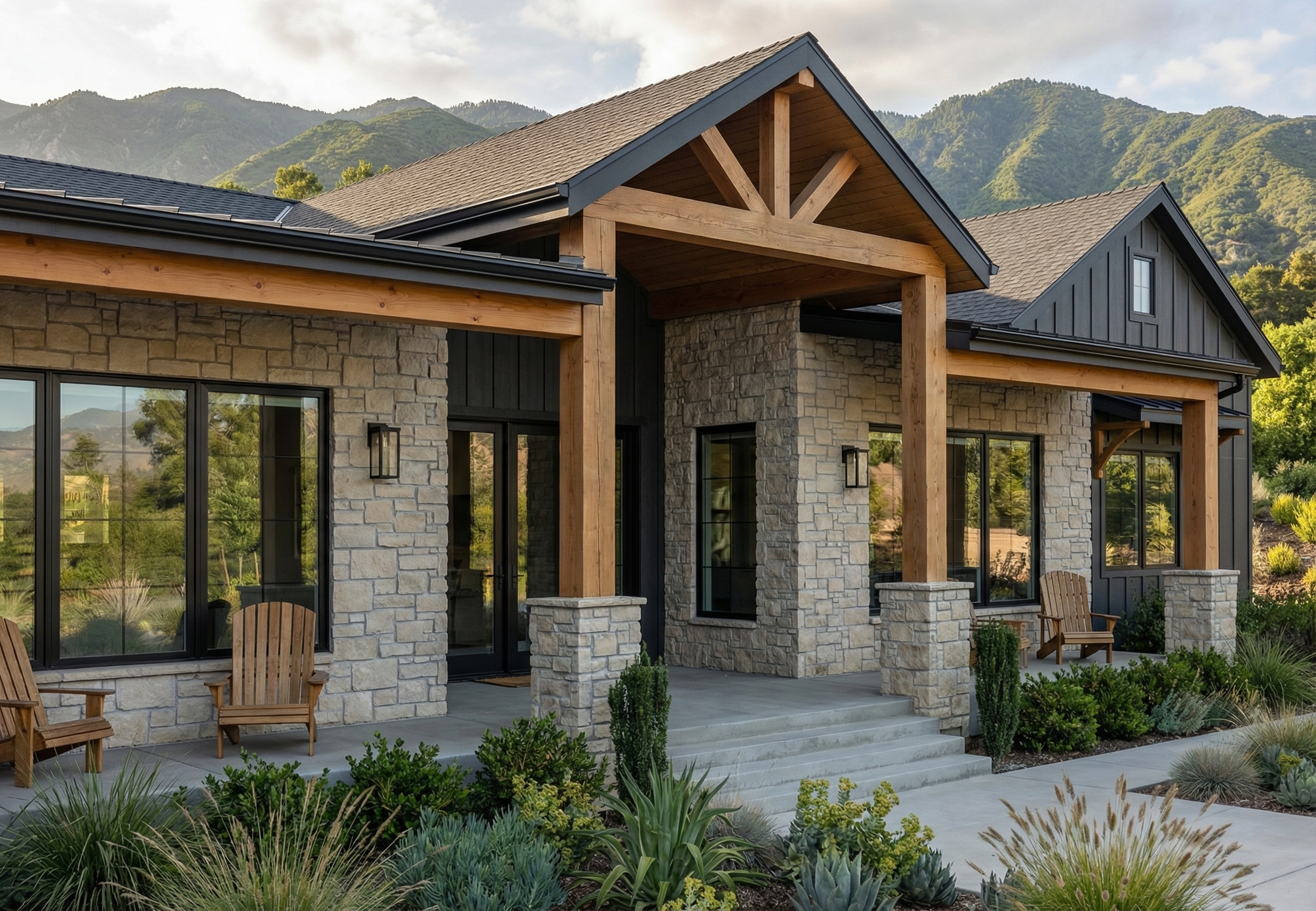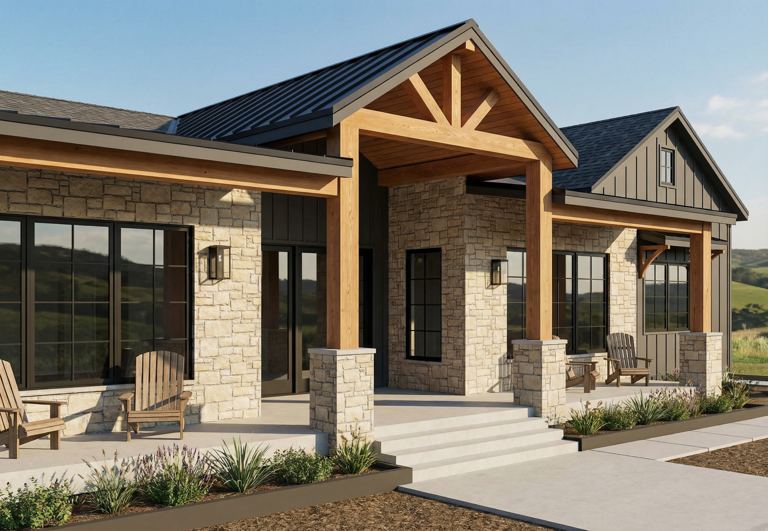 a modern farmhouse with green rolling hills and a few oak trees in the background black windows stacked limestone stained light brown cedar accents black fascia and black vertical nickel gap siding black standing seam metal accents dark gray asphalt shingle roofing layered california native planting time of day is late afternoon