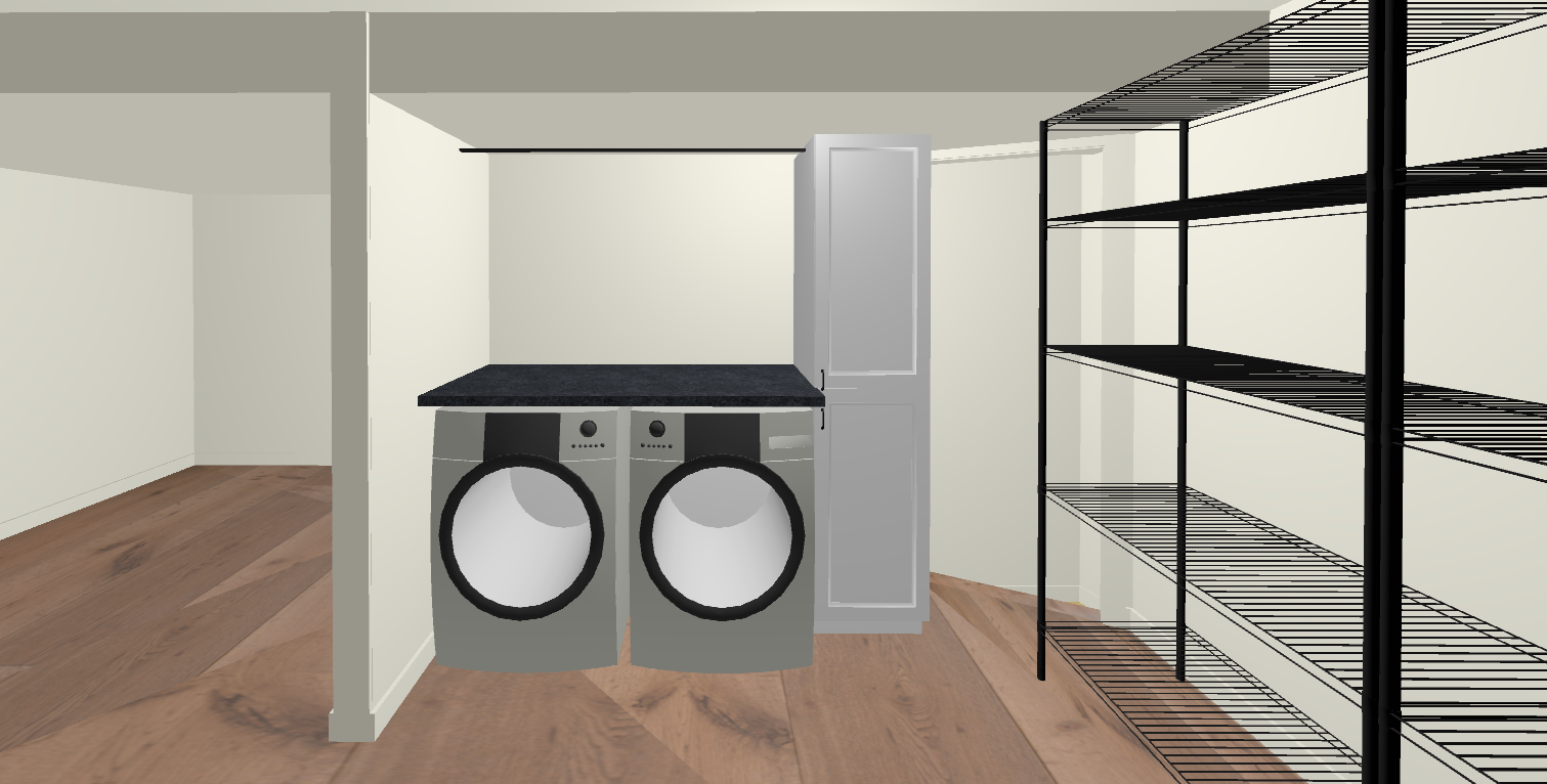 increase thickness of shelf over the rod above the washer and dryer make the washer and dryer red add a large bike hanging vertically seen from the side put the bike on the left side of the dividing wall hang the bike perpendicular to the wall