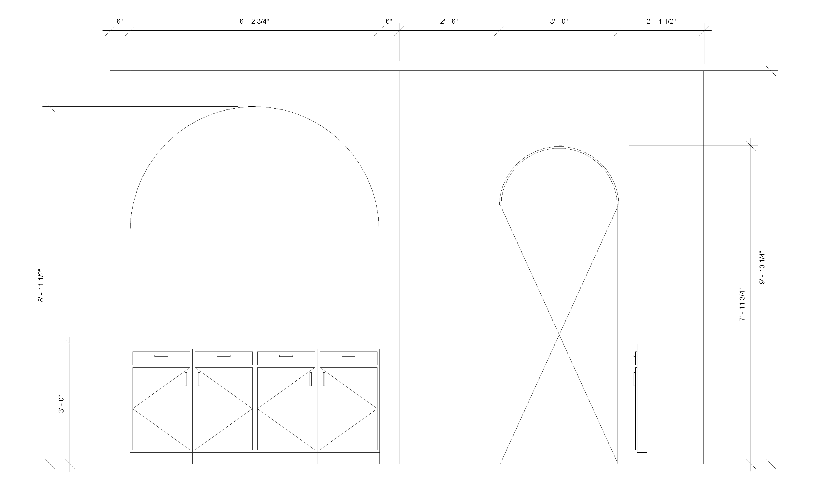 exterior shot keep elevation plaster ivory wall backlit arch alcove lower matte walnut cabinet arched open walkway limestone trim cream stone floors