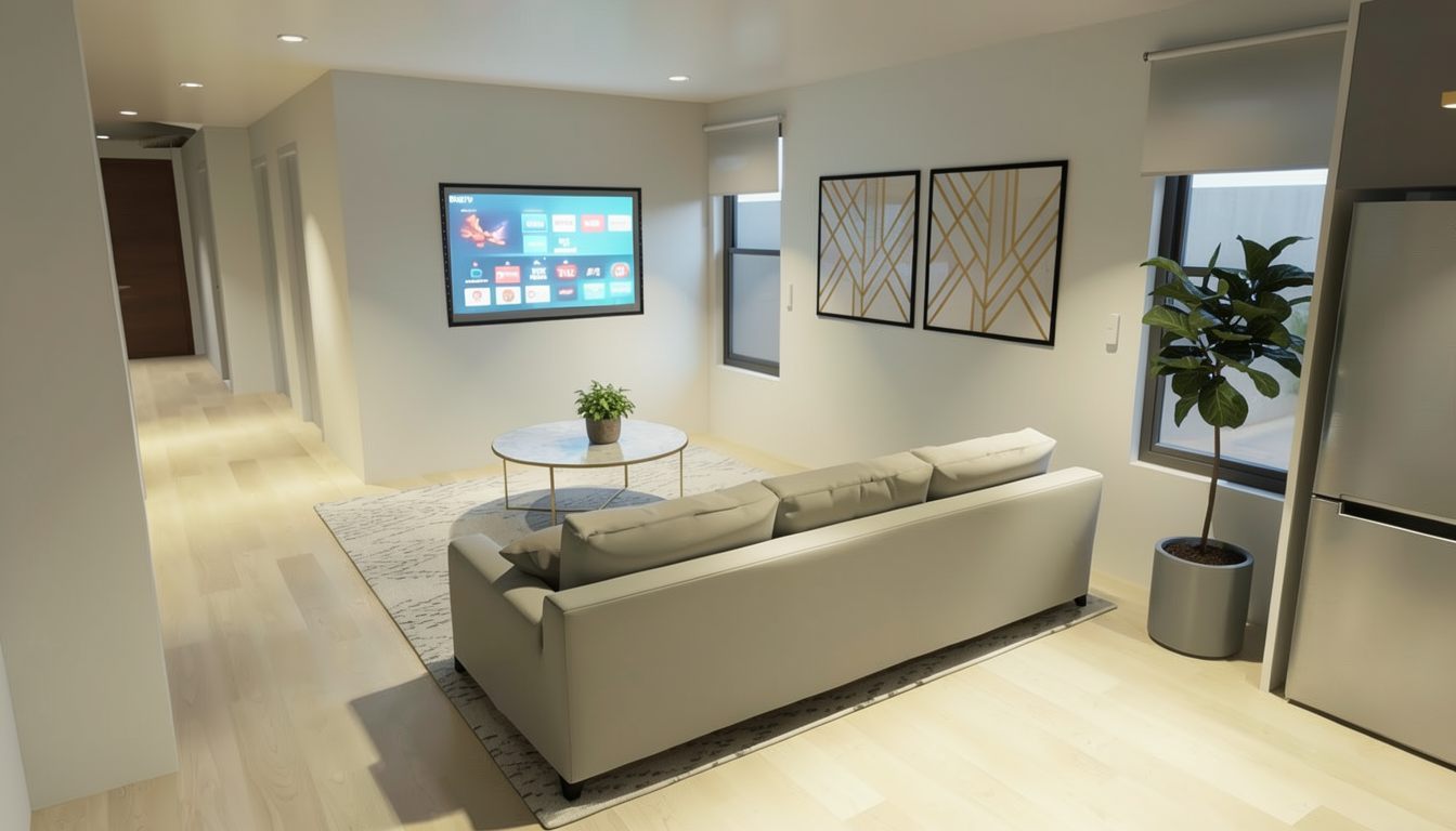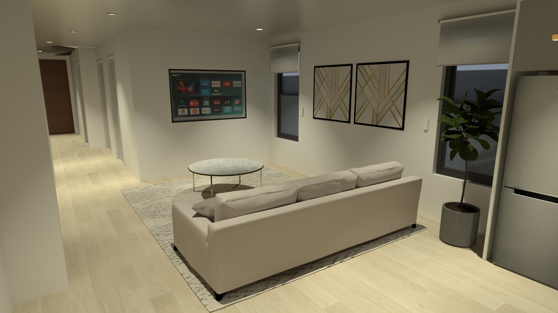 fix the lighting make the tv screen look a bit brighter add a small plant pot on the coffee table add few greens outside the windows