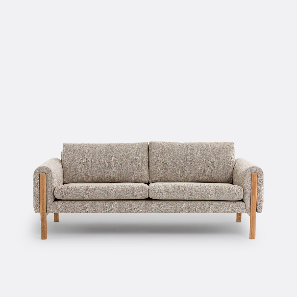 place sofa in a minimalistic room scandinavian design with rustic sand colour large tile flooring soft bright light from a window with shadows coming in from the left minimal and elegant room and composition