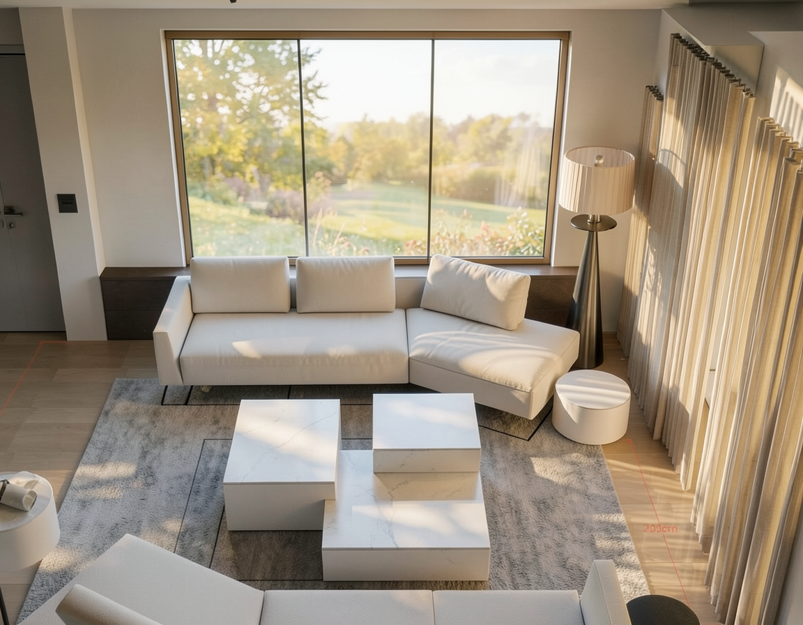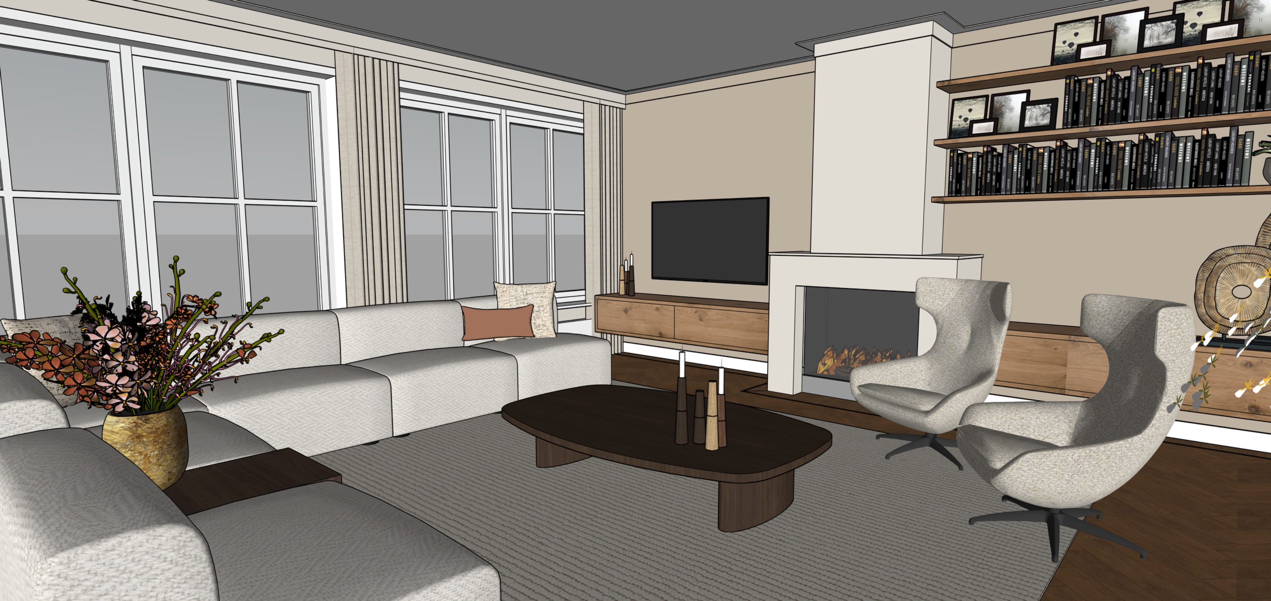 render of 3d model turn on the candles and fireplace with actual fire natural light coming trough the windows