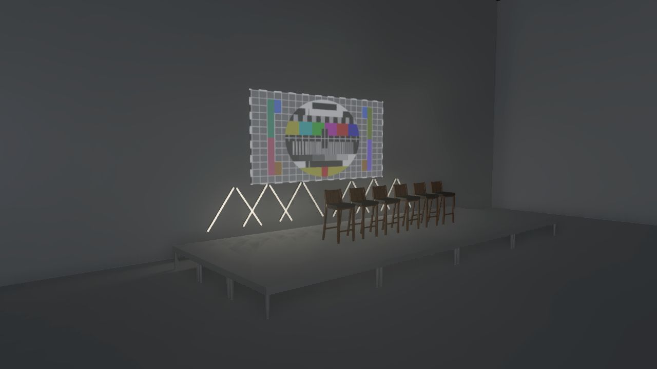 this is the stage of an event stage is full black screen behind the stage led bars in soft blue color illuminationg as a ambient light peaple sitting on chair on the stage architecture