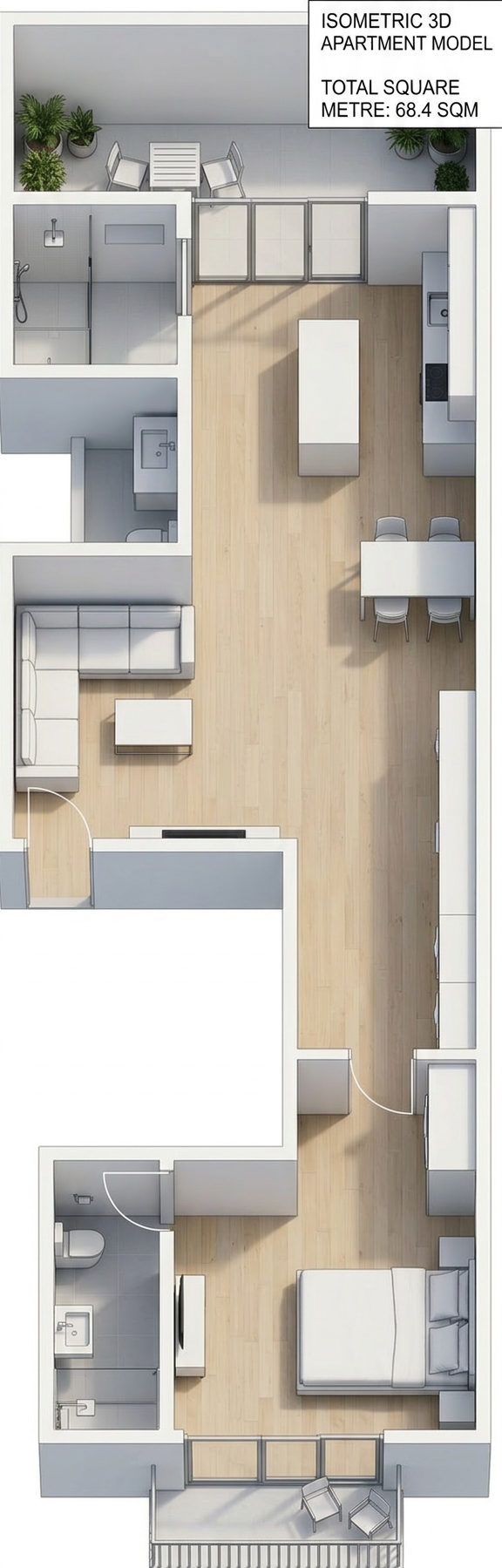 convert this floor plan into a modern isometric 3d view of a full house show the space from an elevated angle with furniture walls and details visible total square metre should be 68 4 sqm use the same furniture as shows on the plan do not change the orientation of the floorplan