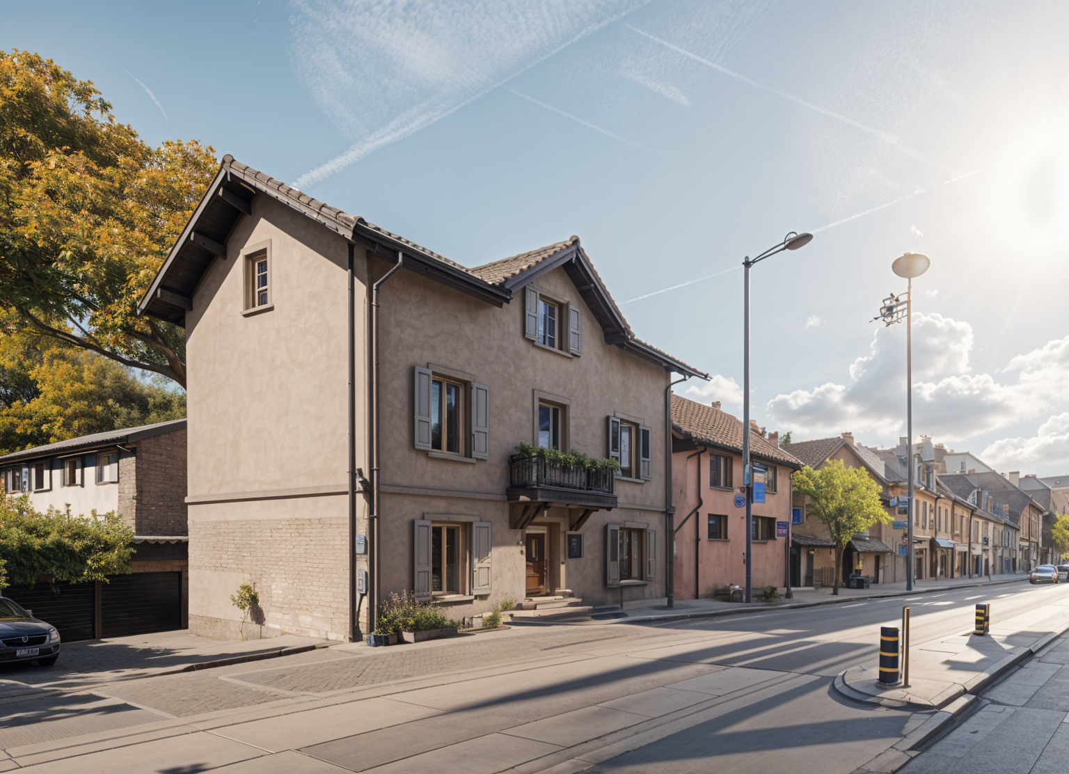 render a modern minimalist house with a white wall with grey accent and gray roof featuring large glass windows surround it with a lush green lawn and a row of evenly spaced tall evergreen trees add a small inviting blue pool adjacent to a charcoal gray patio capture an atmosphere of tranquility and elegance under a soft clear orange sky use realistic lighting to emphasize the clean lines and open space trees and small houses on the background