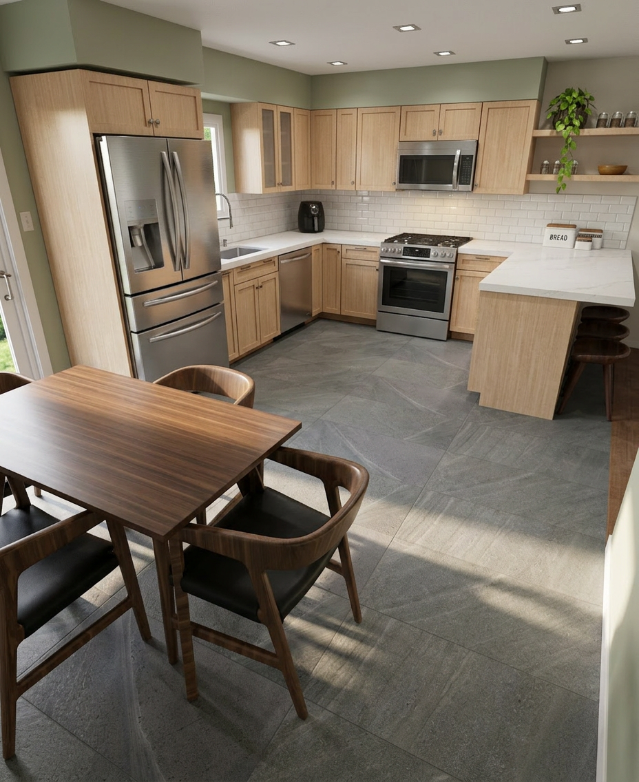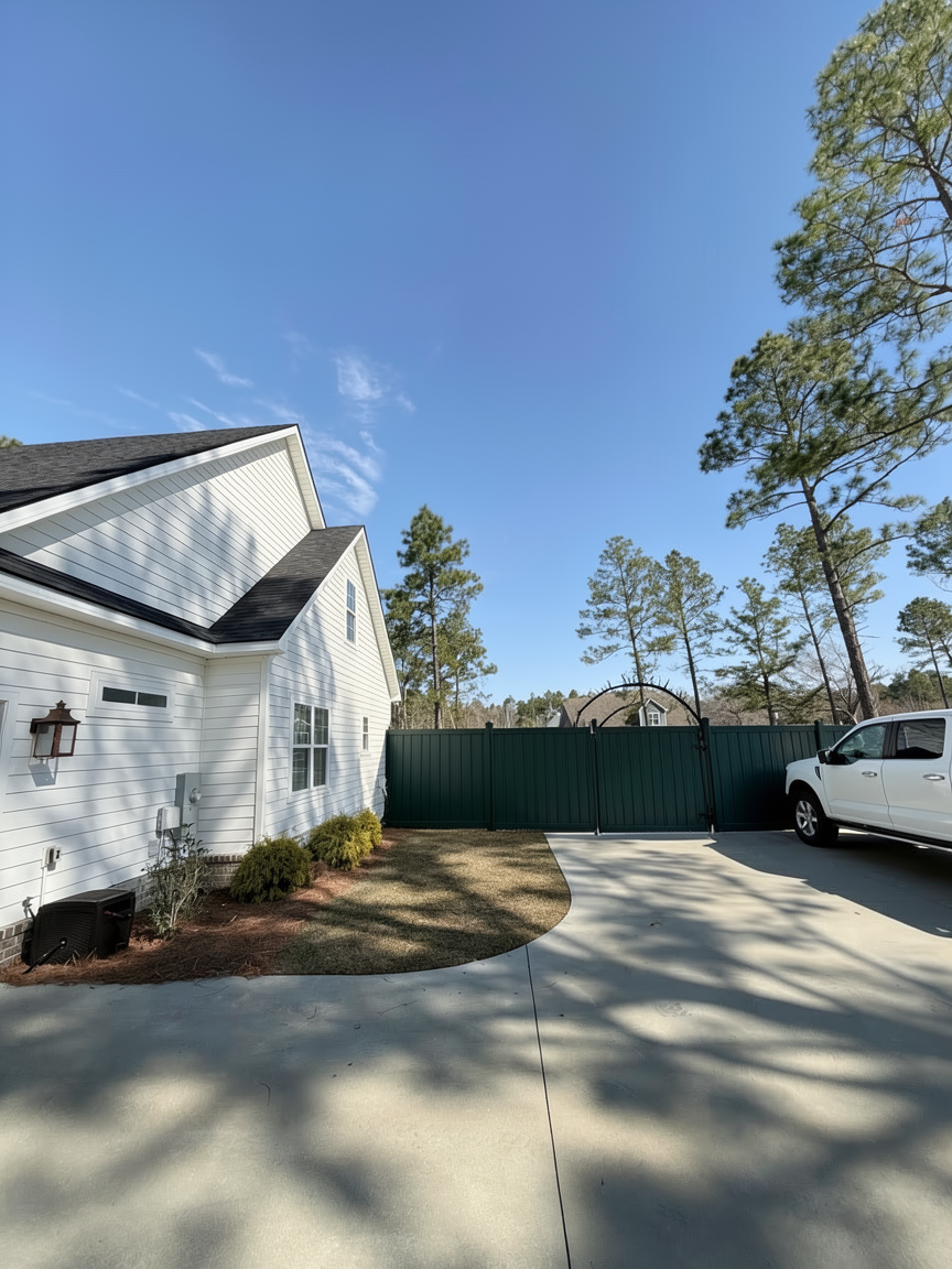 i want you to put a dark green black fence with an arched fence door that connects to the back of the house as a back yard fence