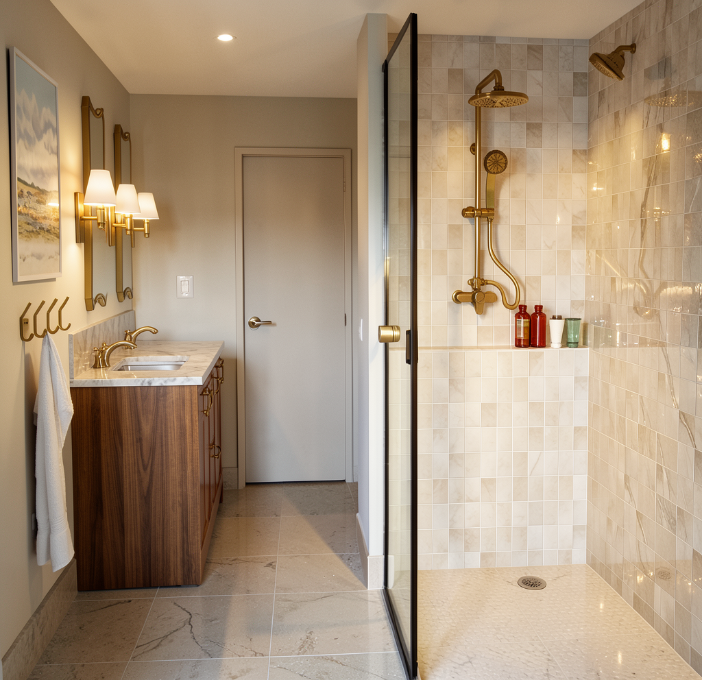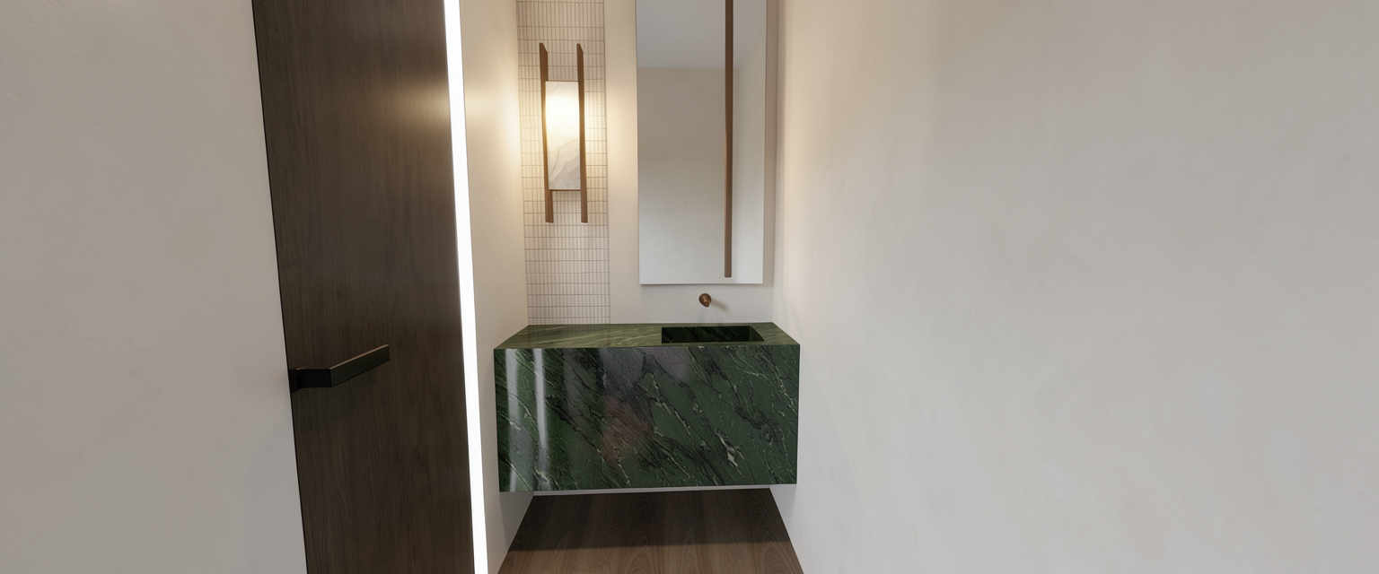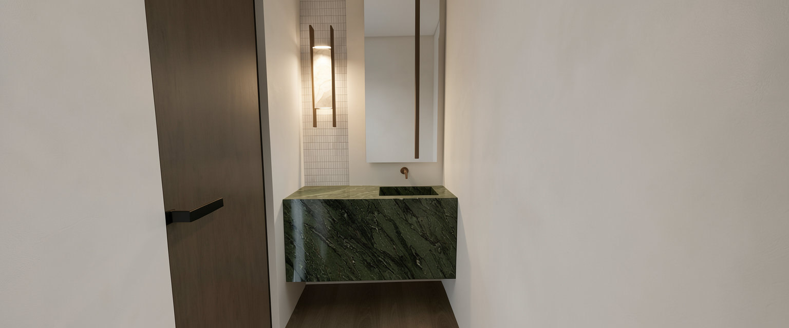 use exact input image do not change layout geometry or camera enhance realism with accurate material definition vanity marble deep emerald forest green marble soft flowing veining horizontal movement veins in muted white sage and light grey layered organic pattern not busy not speckled medium contrast not high contrast polished finish with subtle edge reflections only natural variation not repetitive walls ultra smooth warm white roman clay finish matte soft tonal movement minimal texture other materials unchanged lighting soft slightly moody warm wall light increase shadow depth slightly no bright highlights image quality sharp detailed stone texture no blur no over smoothing style photorealistic interior photography