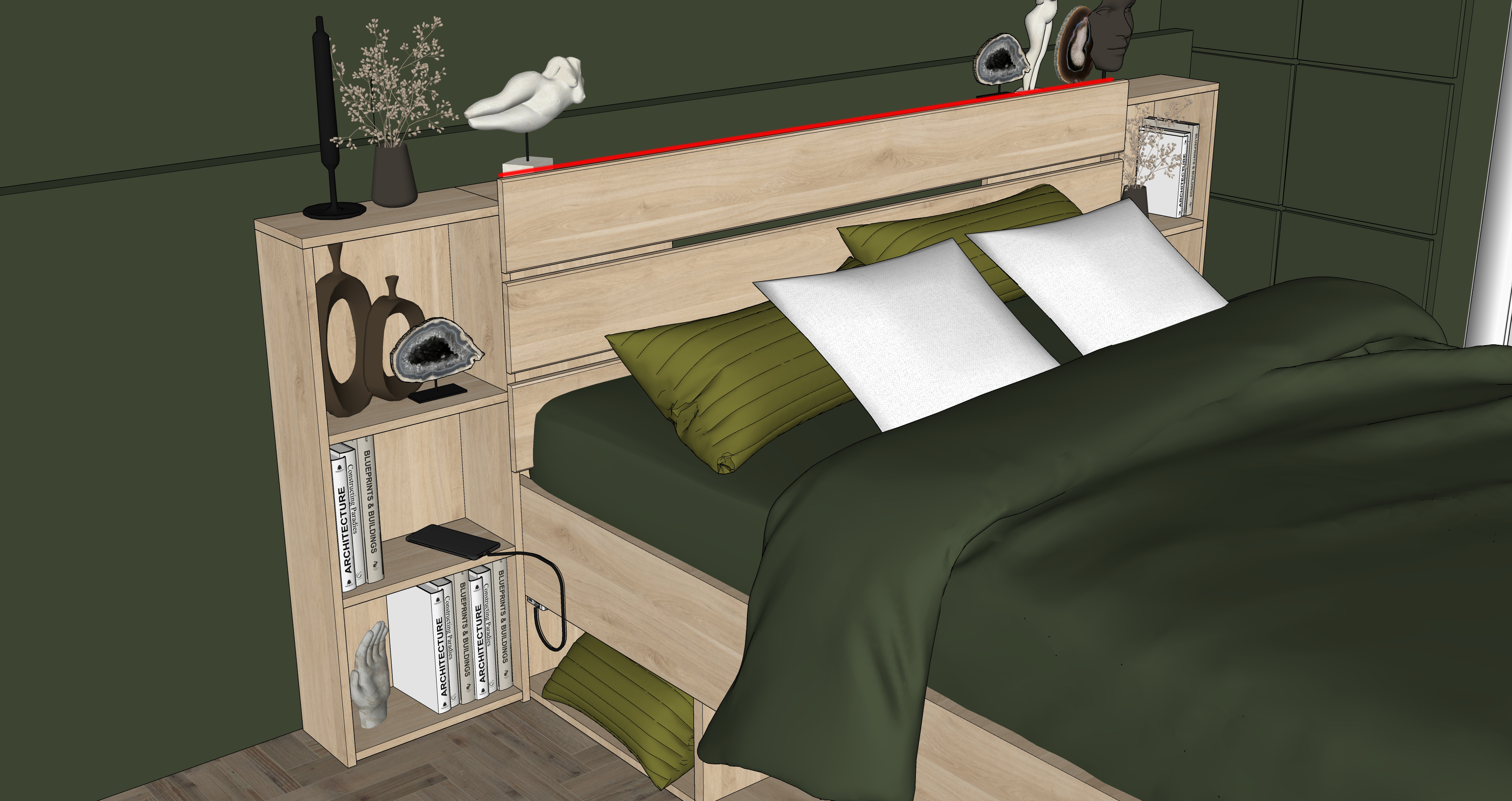 a serene bedroom with a warm and inviting atmosphere the bed features a dark olive green duvet and matching pillows paired with crisp white accent pillows the headboard and shelving unit are crafted from light oak wood books and decorative items in muted earth tones along with subtle beige and dark gray sculptures grace the shelves deep forest green walls create a cozy backdrop the parquet floor is a soft brown and a light gray rug adds softness to the scene natural light streams through large windows enhancing the peaceful ambiance