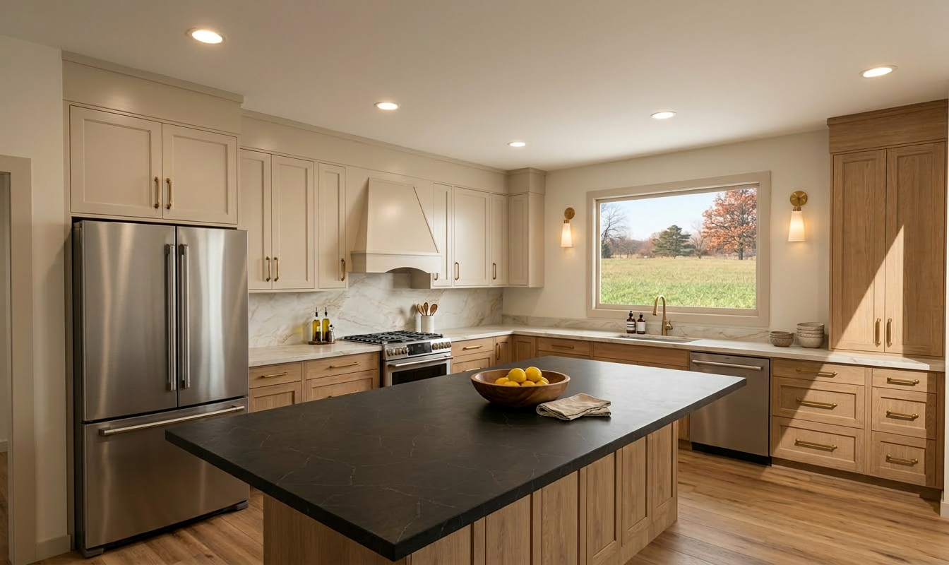 professional photorealistic office interior rendering modern open space workplace with dark walnut wood furniture and light wood accents perforated white plasterboard suspended ceiling suspended linear led lights with visible hanging cables exposed hvac ducts industrial style glass walled meeting rooms imac workstations cozy waiting area with beige armchairs potted plants in terracota pots dark gray matte epoxy resin flooring bright and clear atmosphere high key lighting abundant natural daylight from large windows architectural visualization high end corporate office design ultra detailed 8k resolution photorealistic materials realistic shadows and reflections professional interior photography style depth of field ambient occlusion global illumination