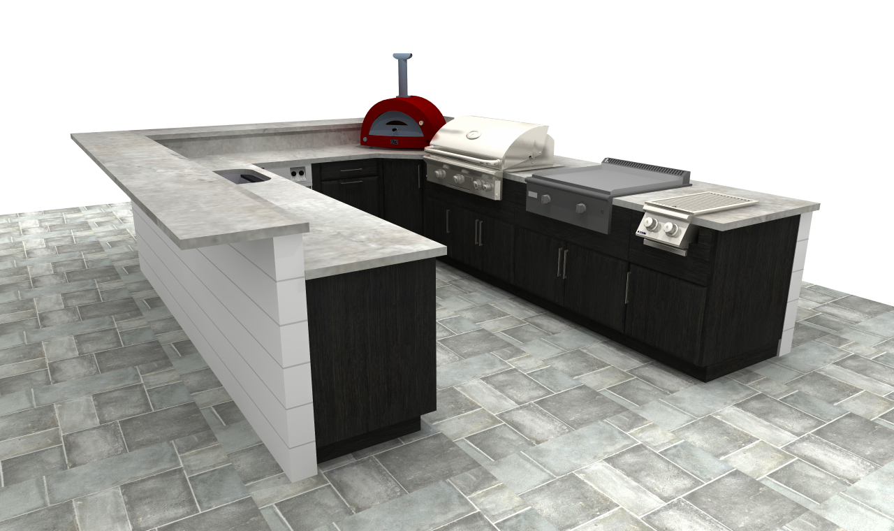 add stools along left side and back side add a white vinyl fence about 18 inches behind the side with the grills add backyard scenery place a pavilion over the kitchen add food and beverages on countertops