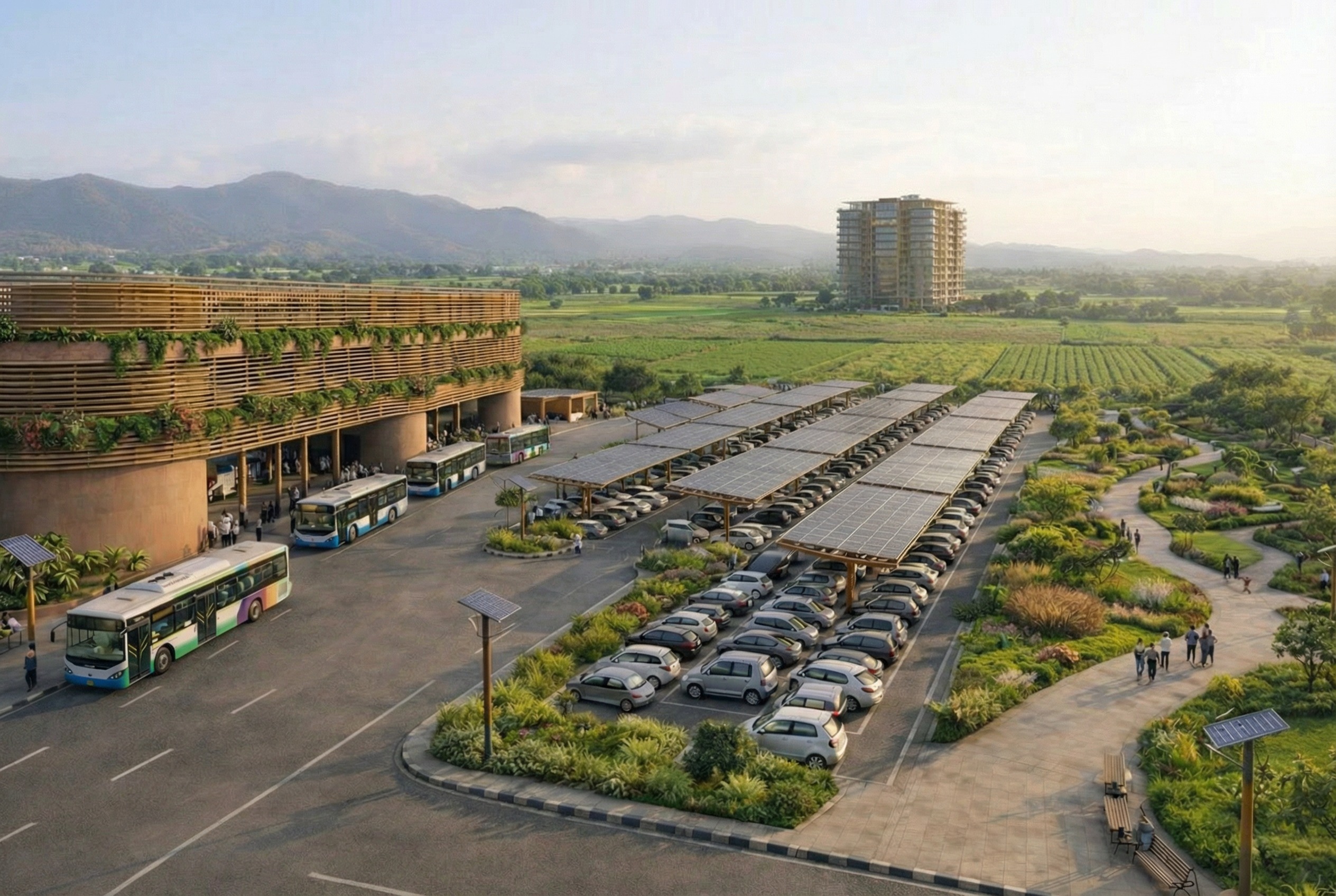 photorealistic architectural render based strictly on the provided image relocate the 10 story building into the farmland positioning it closer and clearly visible the bus circulation road should extend toward and connect to this building maintain original lighting camera angle scale and architectural style do not add new buildings skylines or urban density