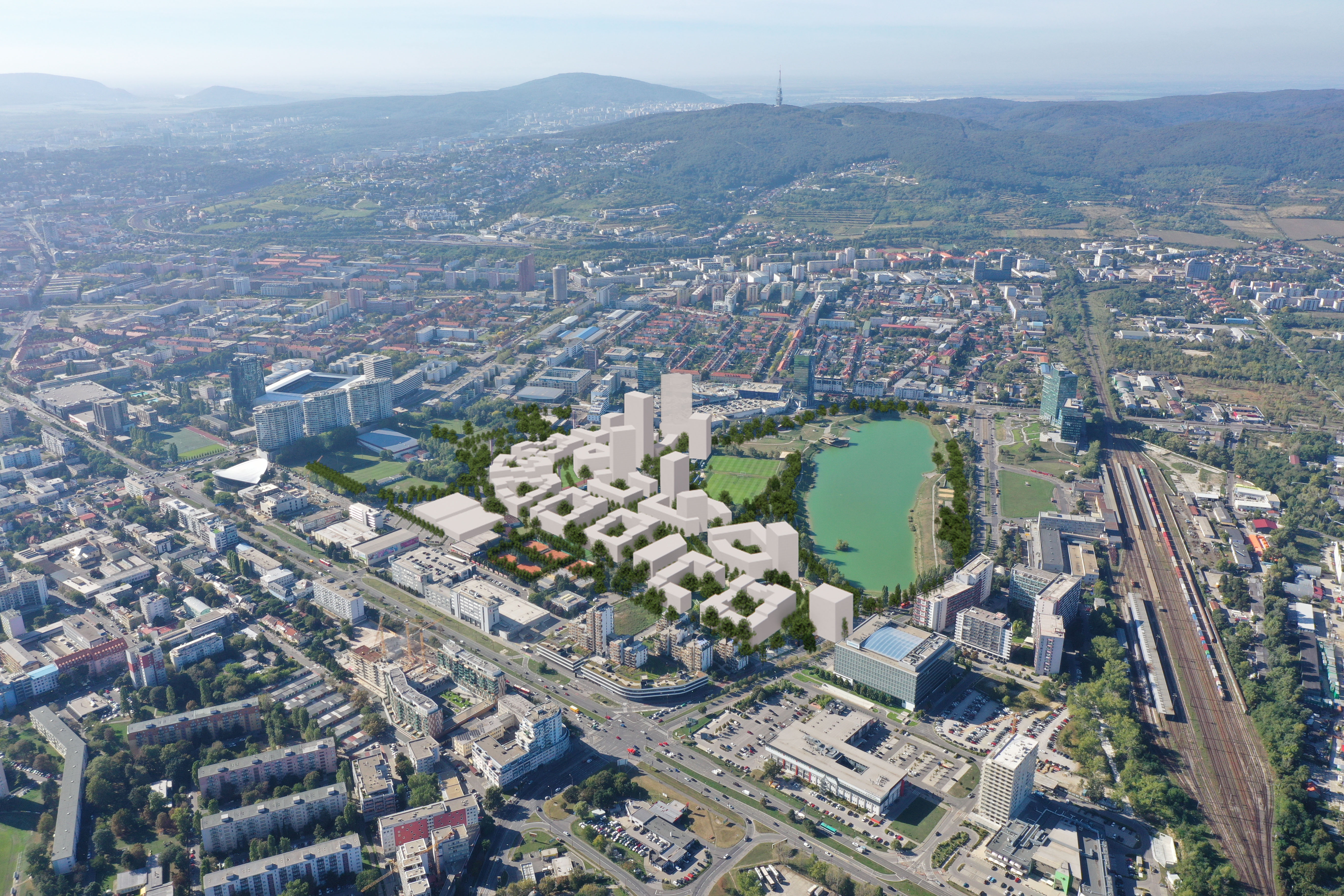 create hyperrealistic render of city lsndscape preserve geometry of white cubes