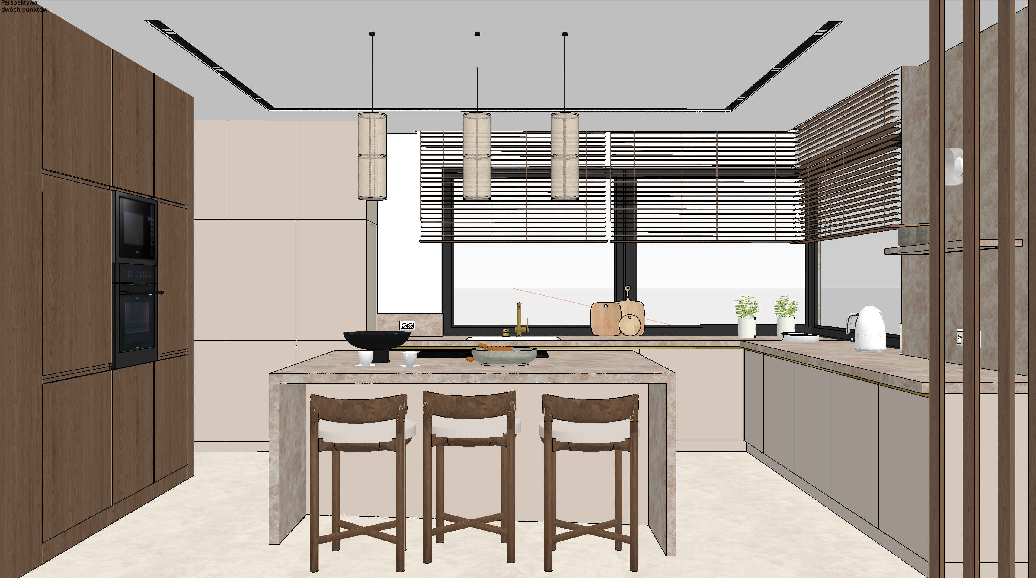 they will render this kitchen in walnut beige panels above the island there are hashira pendant lamps 18 raw audo copenhagen add under island lighting and beige 120x60 tiles on the floor