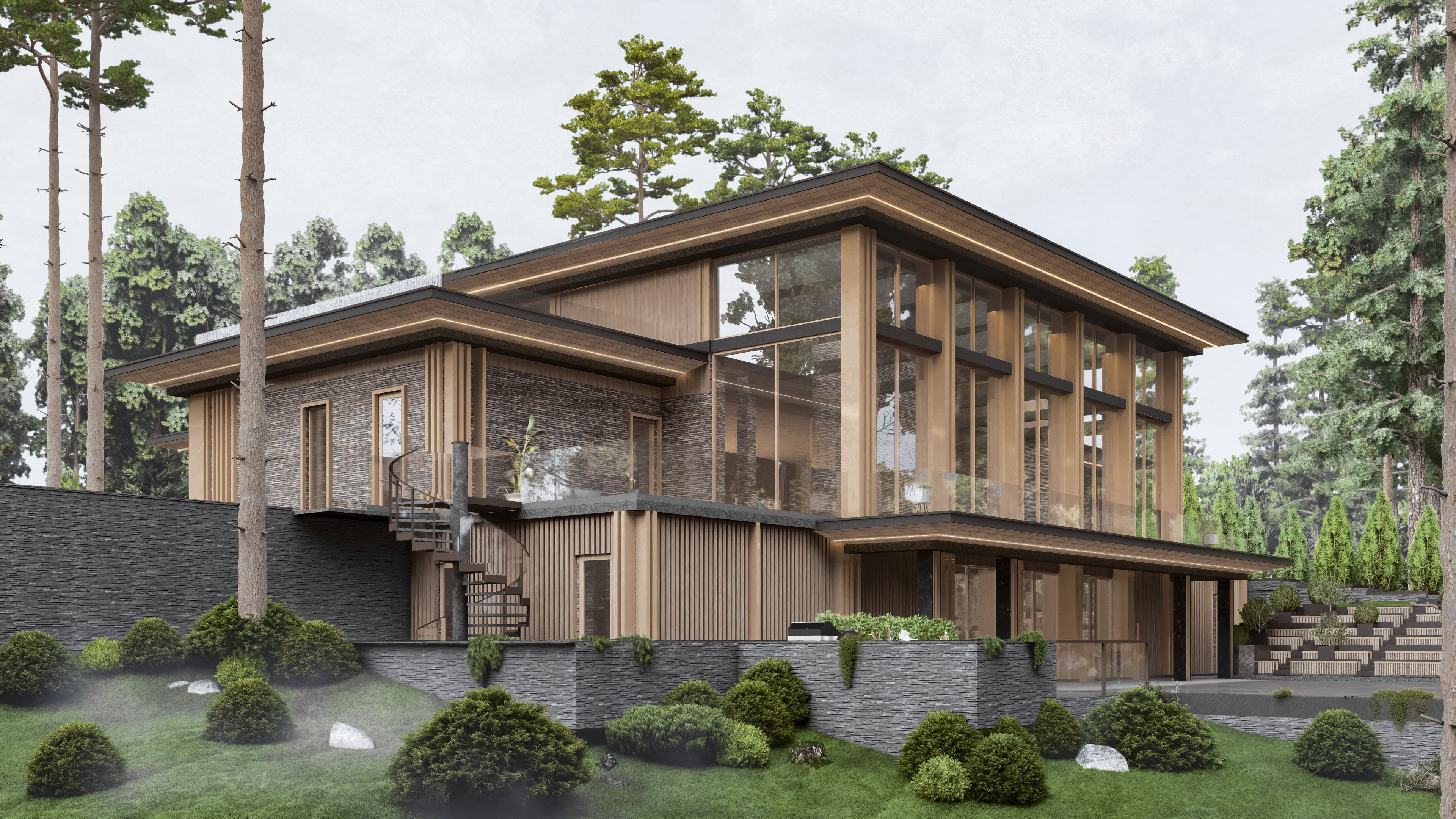 exterior shot luxury eco friendly single story house with a flat roof natural stone walls and large glass sliding doors dark colors material surrounded by pine forestl