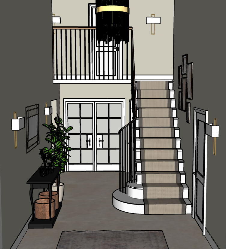 turn on all wall lights and the overhead pendant light with spot lighting on every fourth step of the stairs