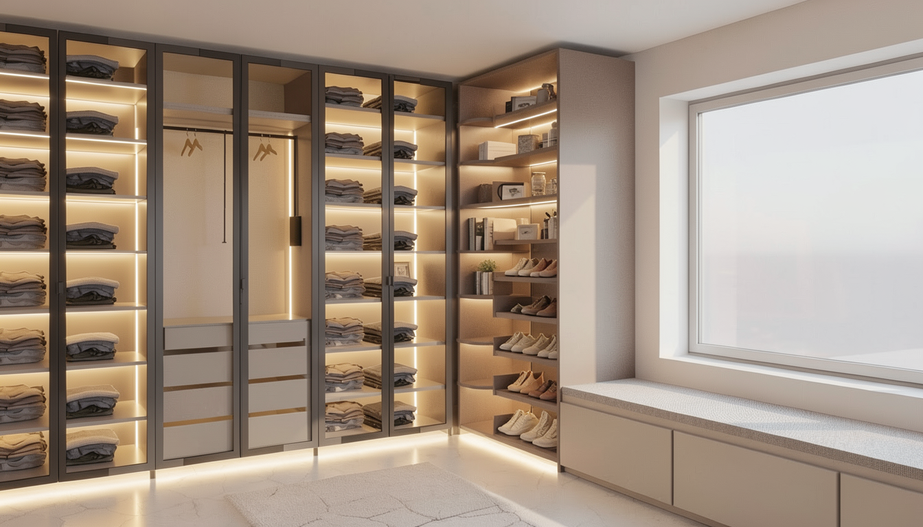 cozy modern luxury closet led lights and soft lights under the footing soft colors on the righjt side is a rolling shelf for accesoriess and the shoes shelvs