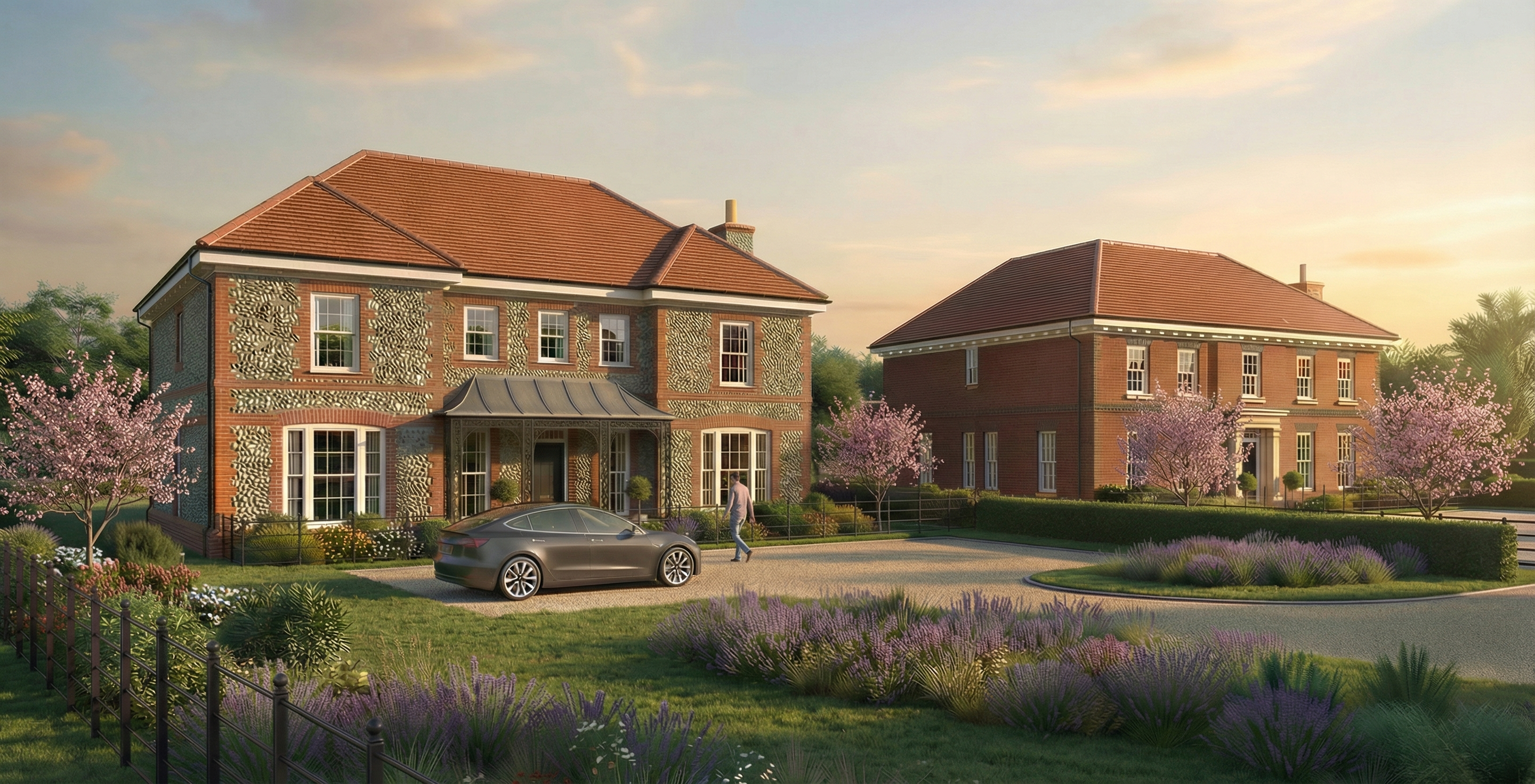make look hyper realistic and give more realistic definition to the planting and landscaping and add a mound of planting between the two houses keep the flint looking as flint on the grey house