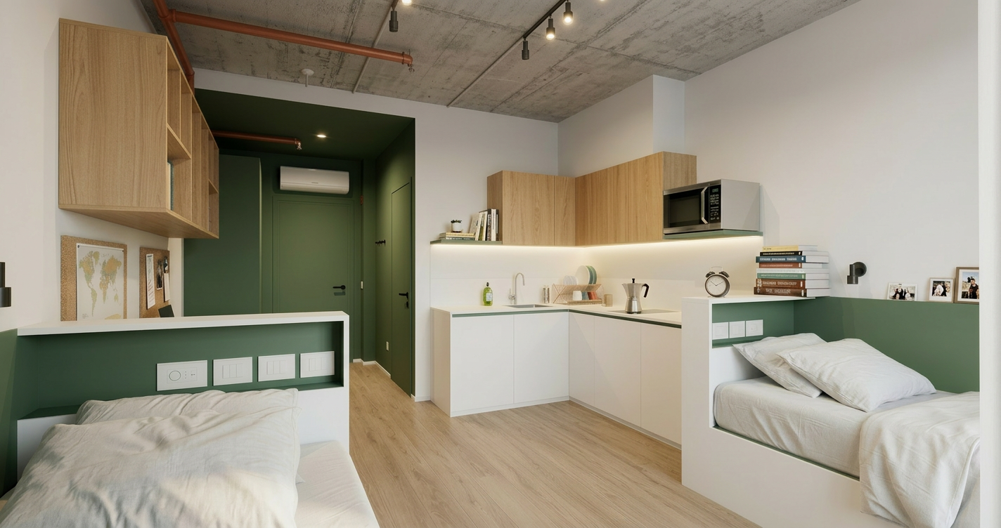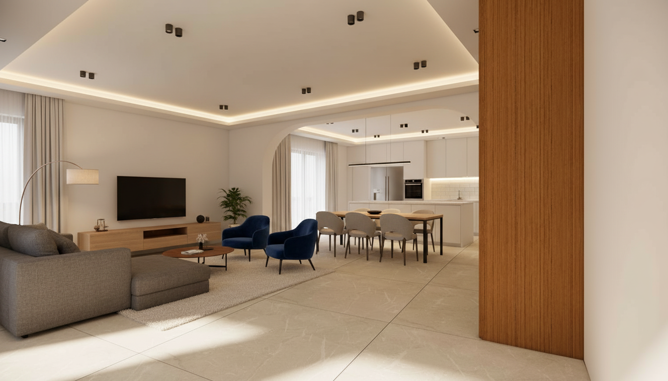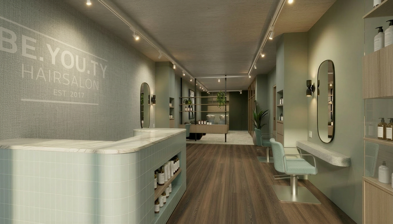the wall on the left needs to have a different wallpaper vescom palena 1070 17 is a vinyl wallpaper with the rustic and tactile appearance of coarse woven linen the color is a subtle calming light grey shade that adds depth and warmth green undertoons to the space the detailed irregular texture naturally catches the light and creates a refined matte finish that perfectly suits the modern and serene atmosphere of the salon do not change the other materials or colors