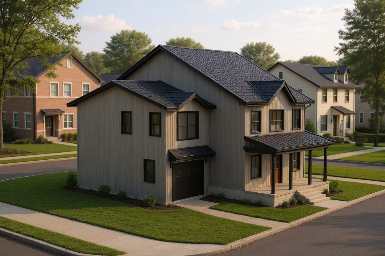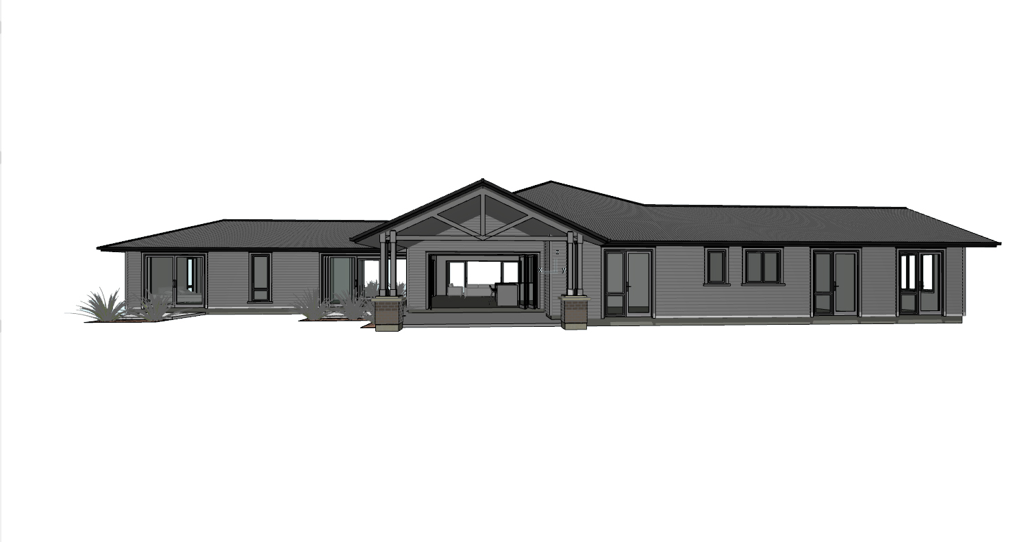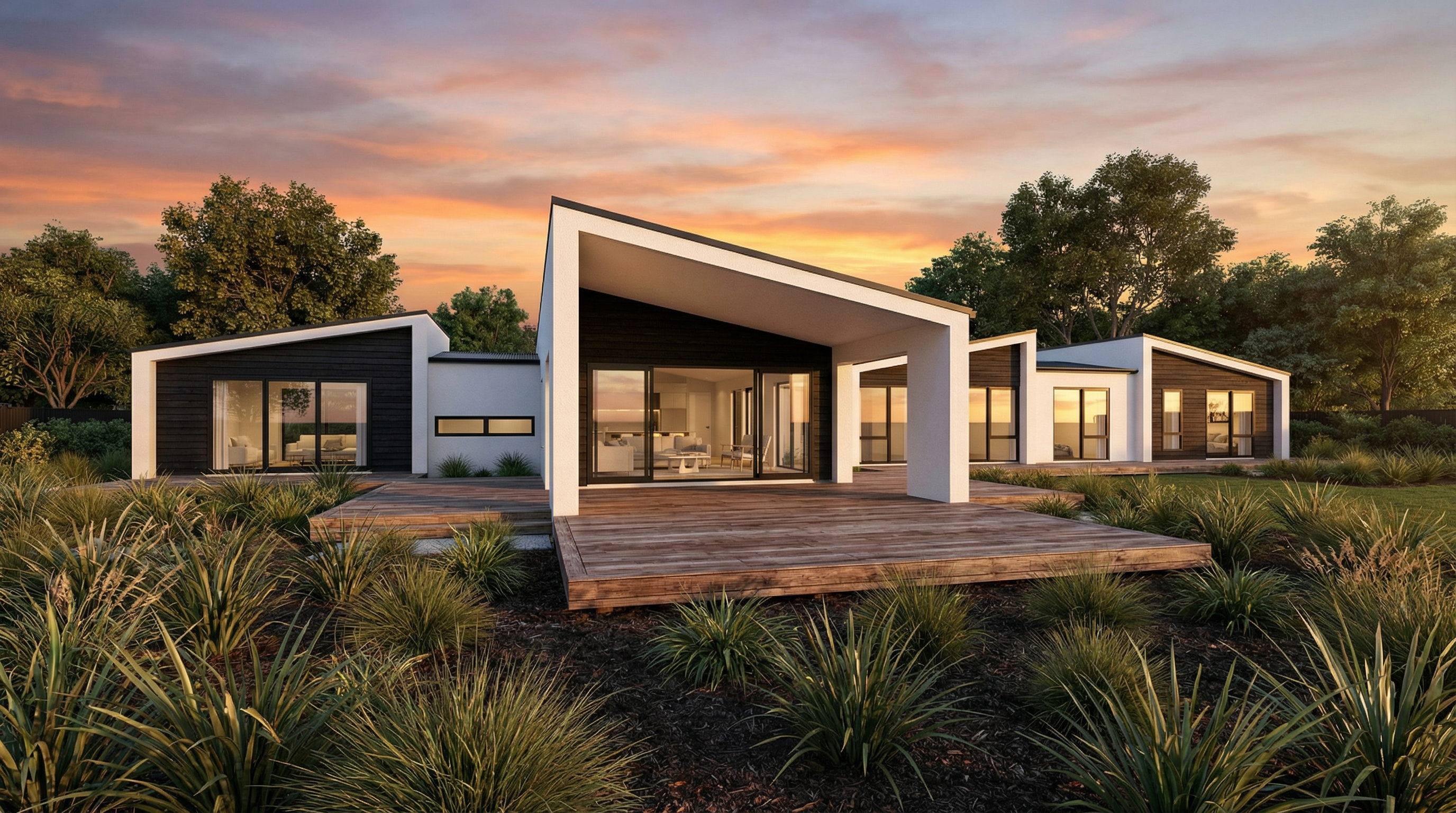 black weatherboard cladding black roof black window frames lawn low timber deck extensive native planting background trees sunset