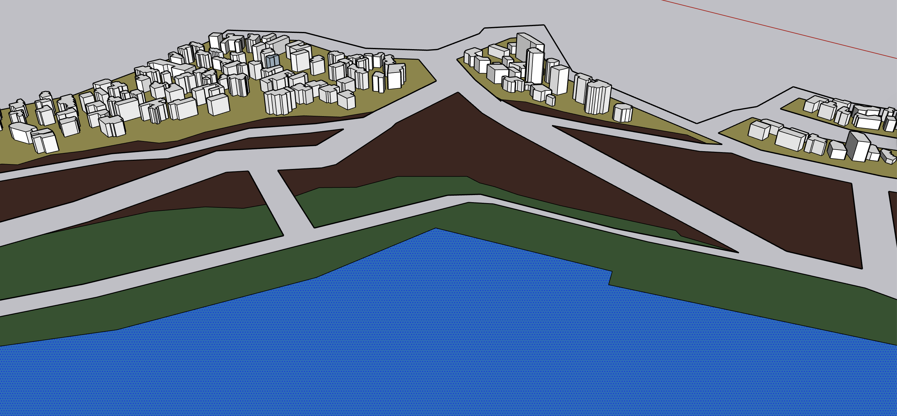 the yellow areas indicate residential zones the green areas represent the coastal restoration zone formed in response to shoreline processes the brown areas mark the government acquired demolition zone which functions as a walkable corridor during low tide the blue areas denote the ocean the transparent areas indicate circulation routes public roads the area located behind the residential zone remains designated for residential use the left hand beach has a steeper gradient behind this area the background is residential area not sea