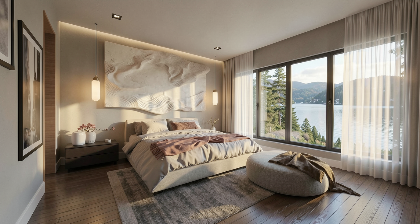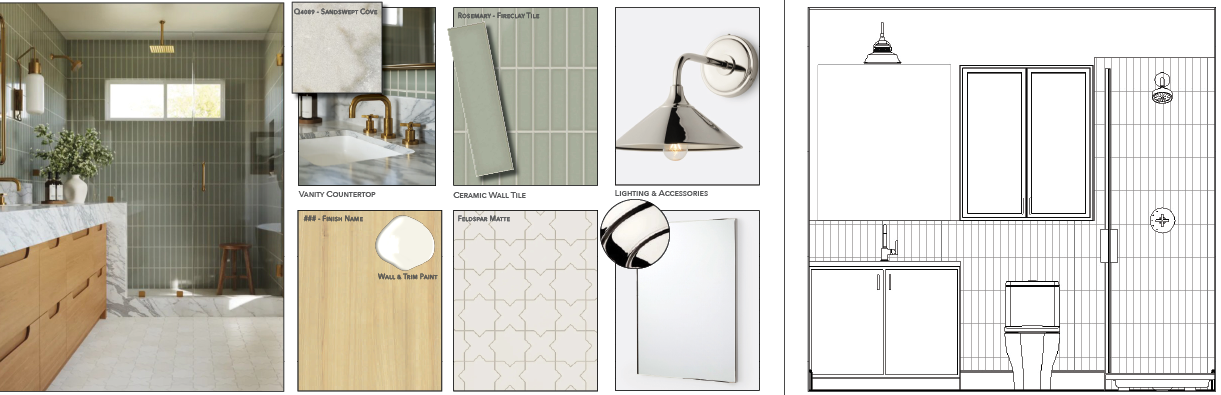 create a photorealistic rendering of the elevation on the right of the reference image modern scandinavian aesthetic shower has the light green tiles stacked wall behind toilet has the same green tiles stacked up to 46 with smooth walls above painted a warm neutral white warm light oak vanity with honed marble countertop polished nickel finish on all hardware fixtures and accessories wall cabinet painted light taupe with fluted glass panels inset in cabinet doors floor tiles are white star and white cross pattern like the photo toilet is white use downward facing light from the sconce above the mirror use general indoor 3000k lighting in the room frameless glass shower partition between toilet and shower