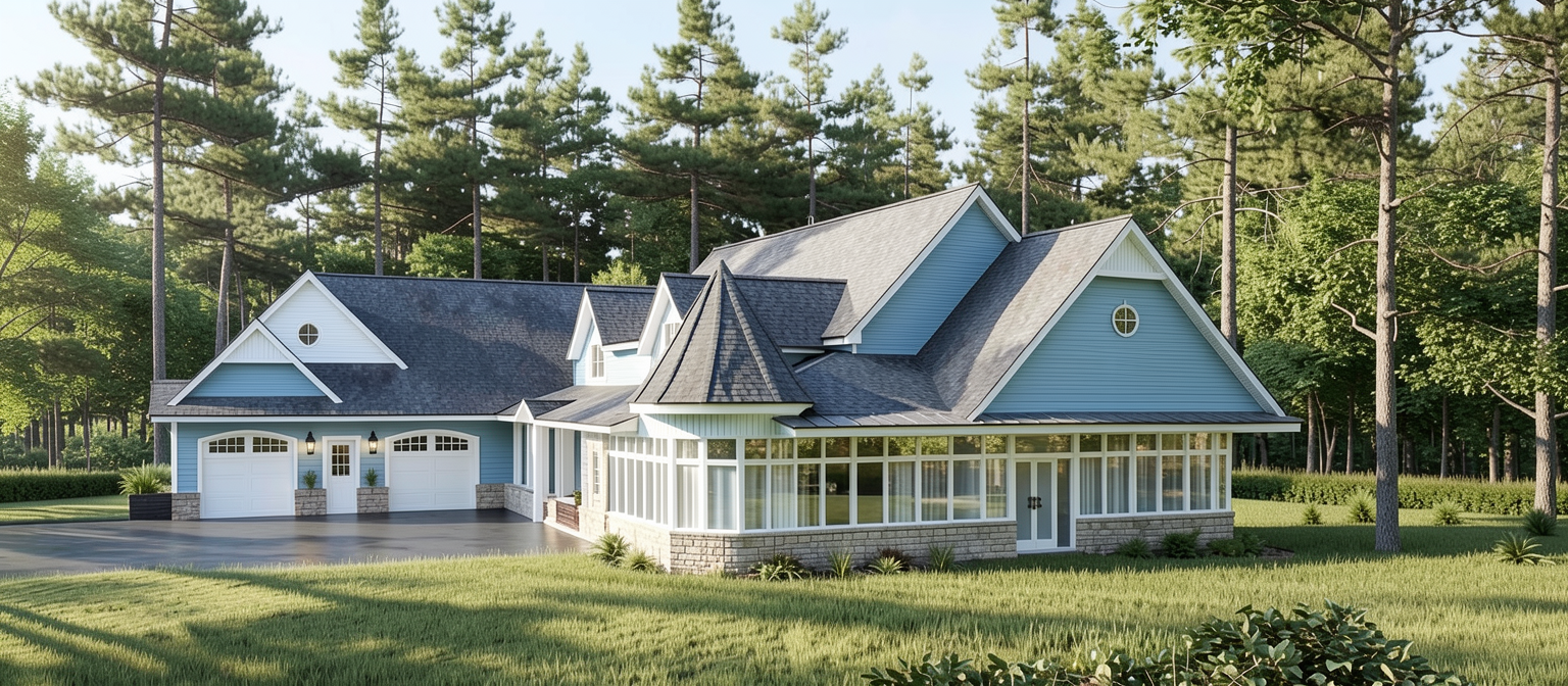 brown slate roof no landscape in the sunken area of the tennis court couple trees in the background