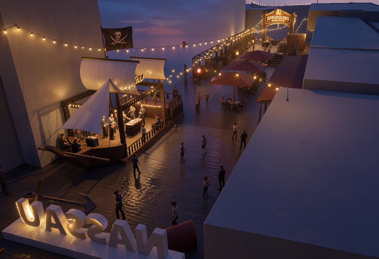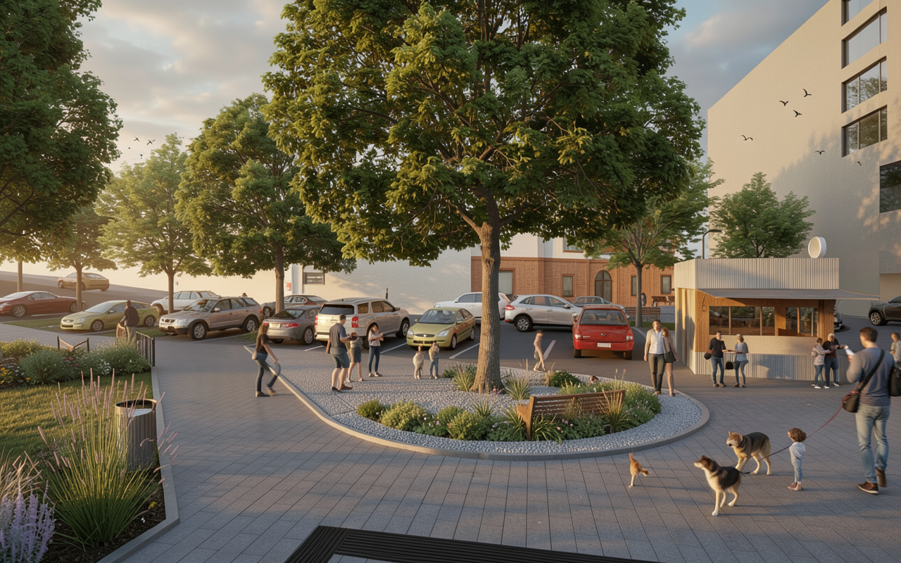 ultra realistic architectural visualization based strictly on the provided raw sketchup view preserve exact geometry proportions camera angle composition and architectural details do not redesign or alter the building enhance only with realism add realistic materials with physically accurate textures natural wood grain brushed concrete glass reflections subtle imperfections micro surface details use high dynamic range lighting with soft global illumination and realistic shadows create a lively atmosphere add naturally positioned people interacting casually walking talking using phones subtle motion blur on some figures for realism include small groups rather than posed characters add a few animals appropriate to the setting e g dog on a leash birds in the sky avoid people and dogs in the middle of the road enhance environment with greenery slight wind in trees varied vegetation tones small urban details parked cars benches subtle signage add depth with atmospheric perspective and realistic sky conditions golden hour soft overcast choose whichever enhances the mood cinematic composition photorealistic rendering 8k detail realistic depth of field natural color grading slightly warm tones architectural photography style shot on full frame camera 35mm lens maintain realism over stylization avoid cartoonish or ai looking artifacts preserve the compressed gravel taxture and corten arc around the tree